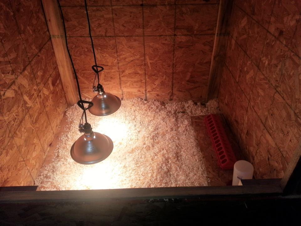 My brooder is four feet by eight feet and divided into two sections. It is in our garage because we raised winter chicks in it. We mounted four heat lamps inside of it and the center wall is removable to make it a large brooder which is what we just did for my six turkeys to stay in it a bit longer. Here are photos.