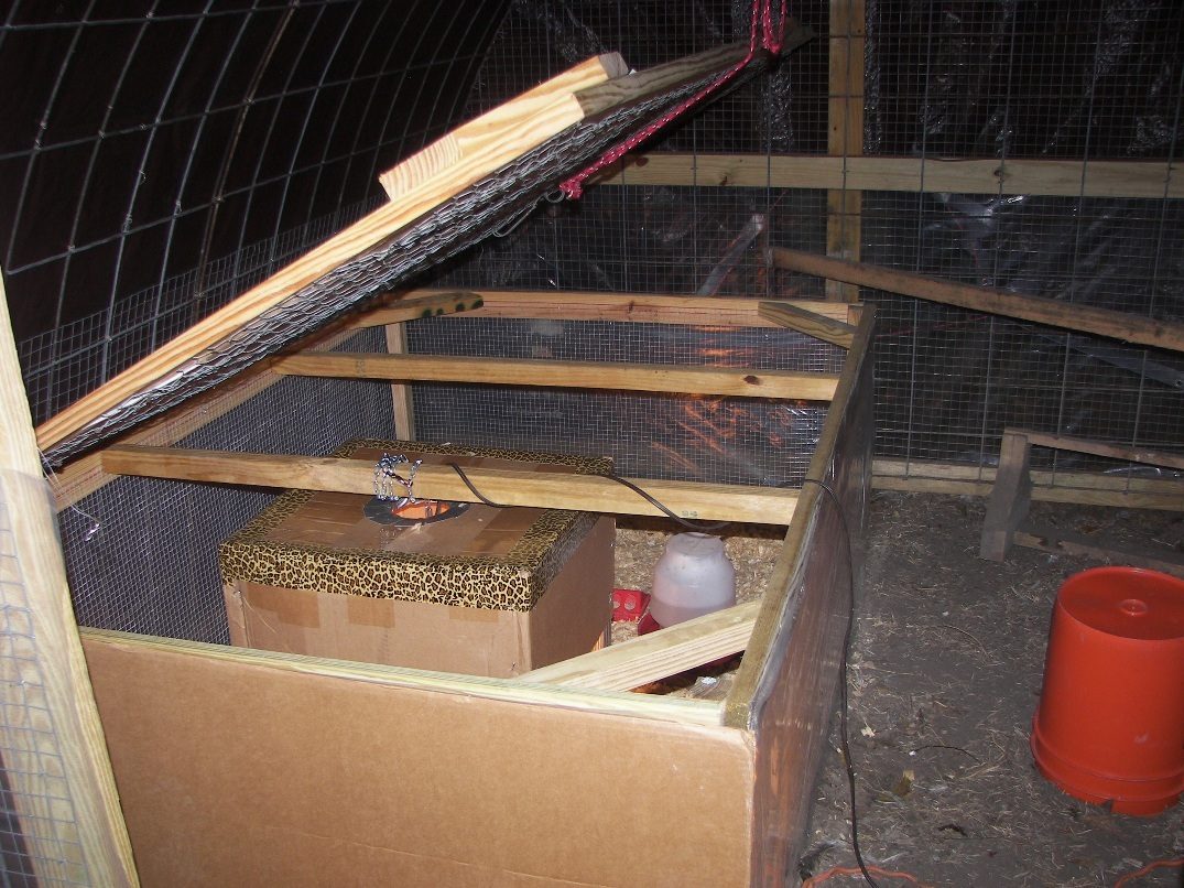 2x4 welded wire and some 1/2" hardware cloth top is hinged. Front folds and slips under wood at front edge of top.