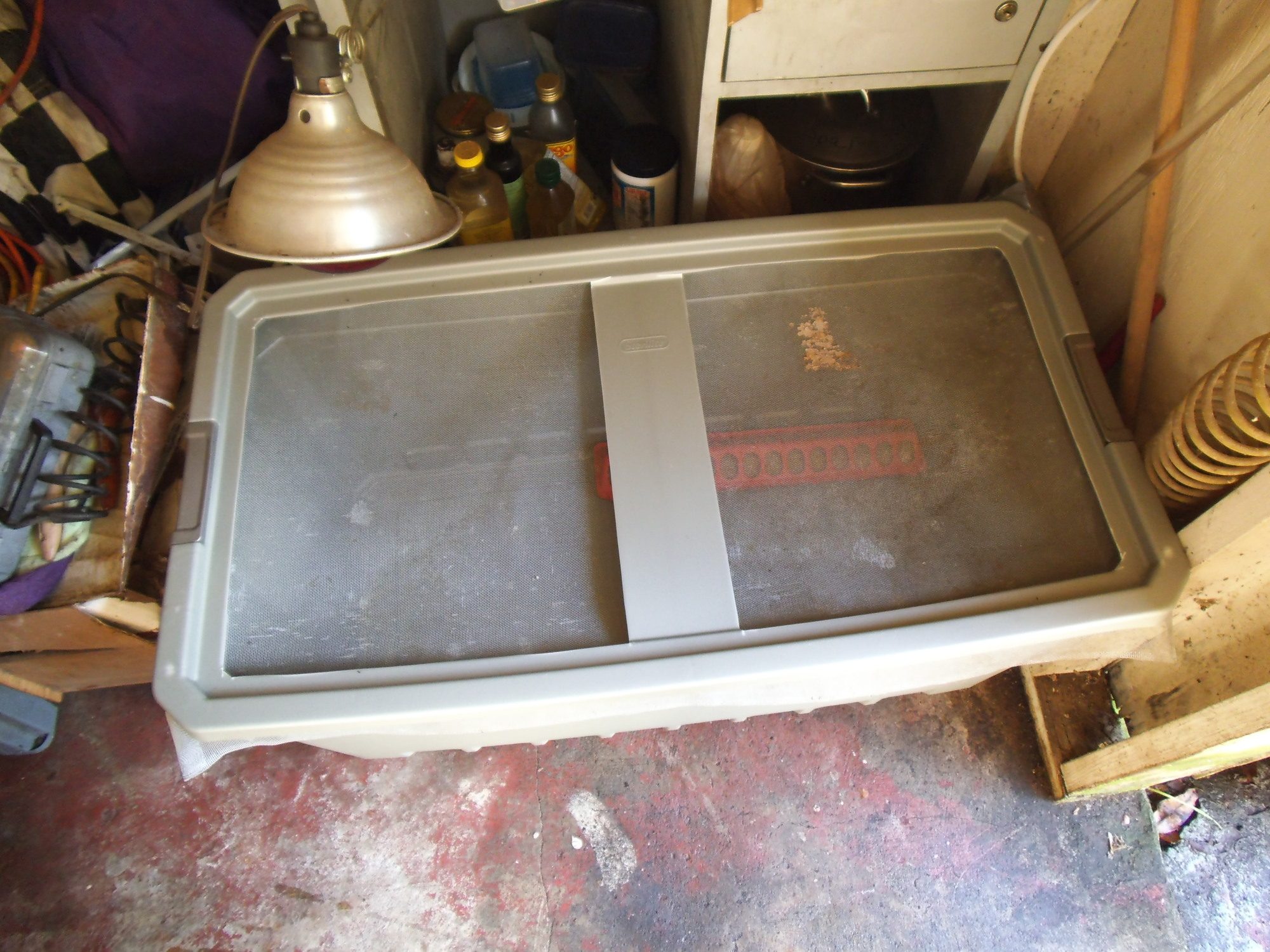 I use a plastic bin for about the first week or so in the basement, then when they get a little bigger they move into the bigger brooder box in the garage.