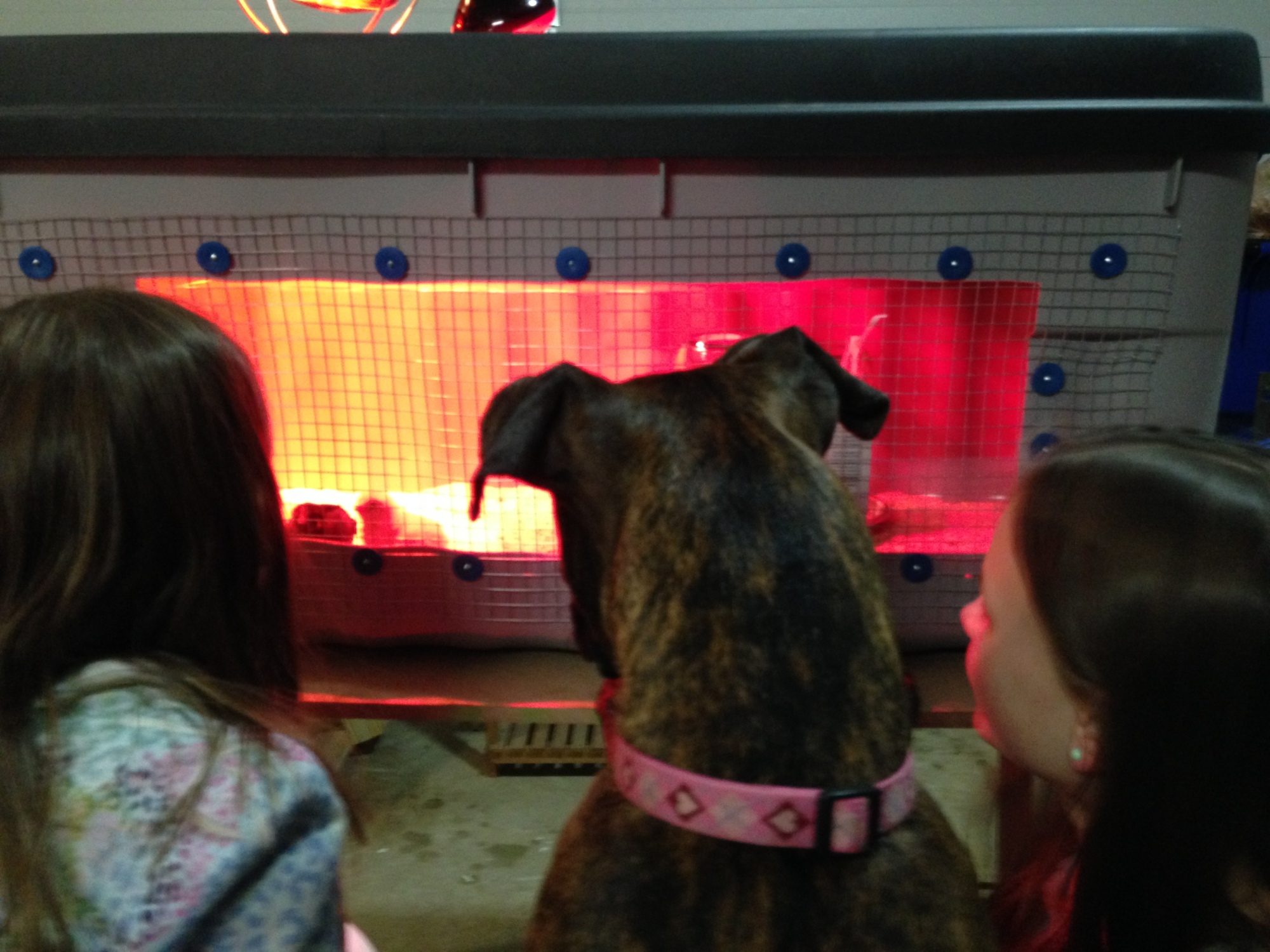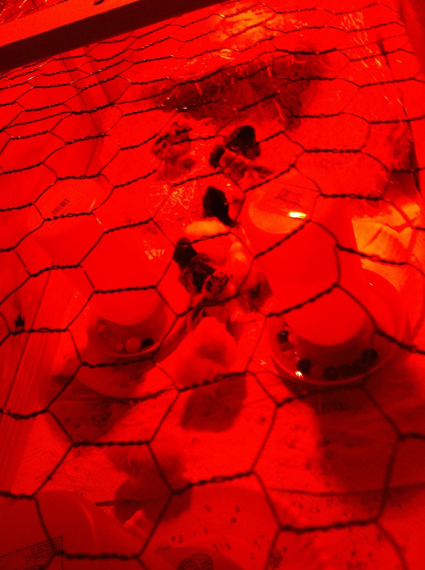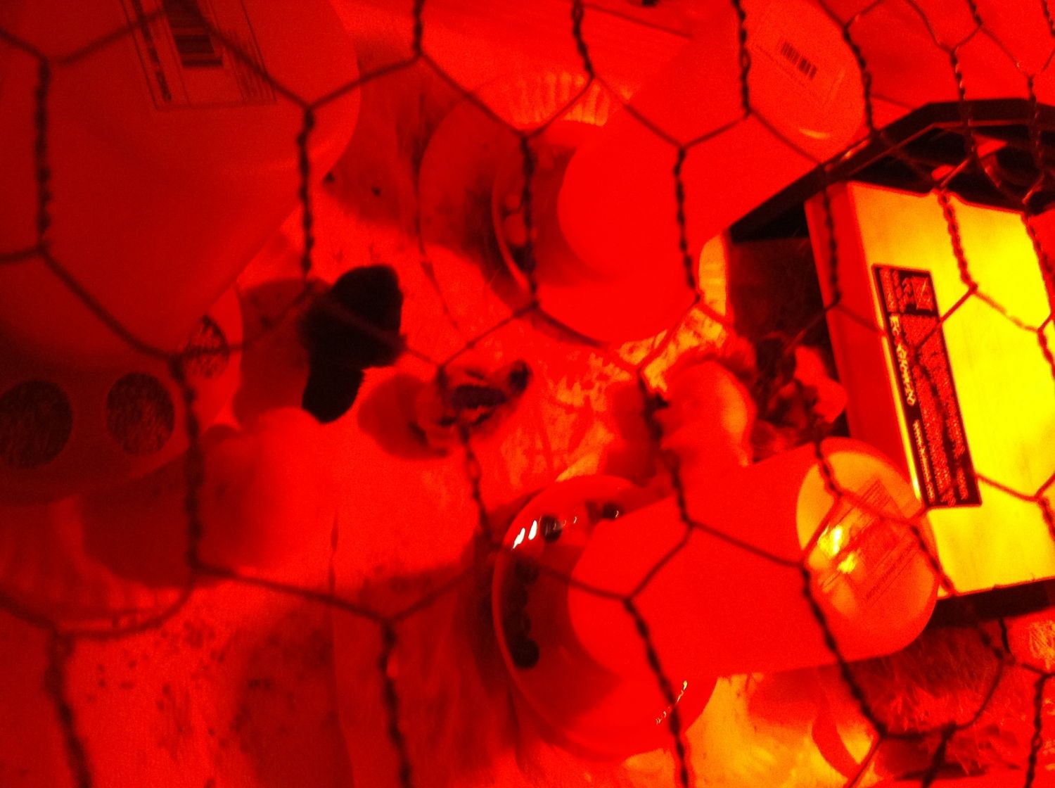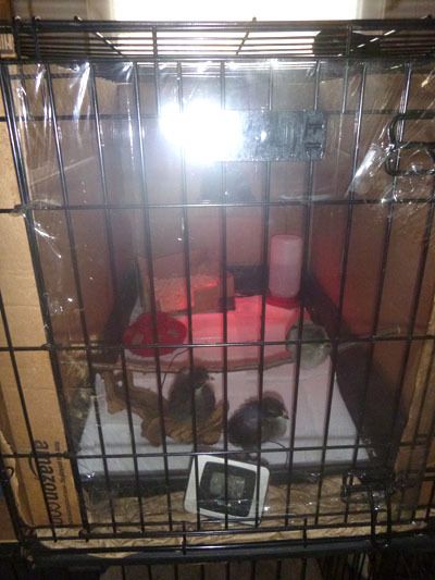 Here is our plastic storage bin style brooder - so far so good for 4 baby chicks- now 5 days, I have the brooder on a table in the garage, garage temp stays about 60 degrees, with heat lamps hanging securely by chain from the garage door motor keeping the brooder about 95 in the warmest area. I am using sand on the bottom which is working out great - very easy cleanup! Even the family boxer loves watching the chick action from the viewing window....