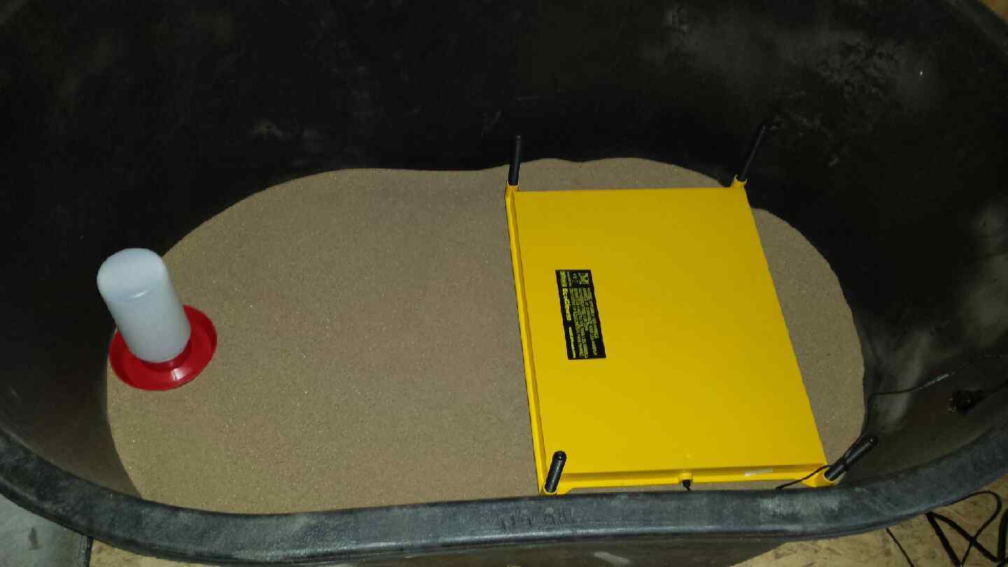 My chicks won't be in for a couple more weeks, but I have everything pretty much ready to go. I will put down paper towels over the sand and place in the other food and water containers when it's time.. I just wanted to see how much room I would have in there for them. The brooder is in our garage.