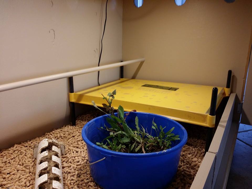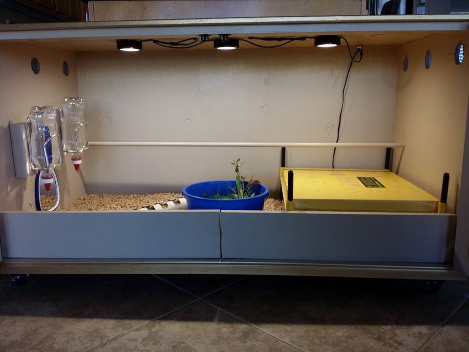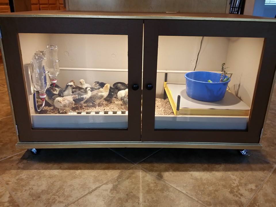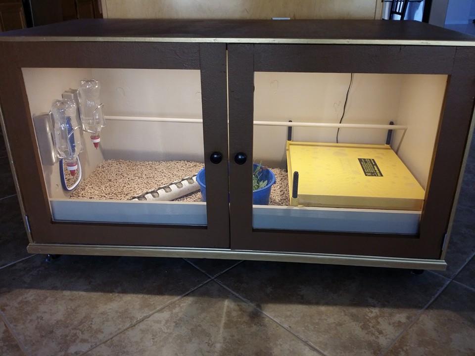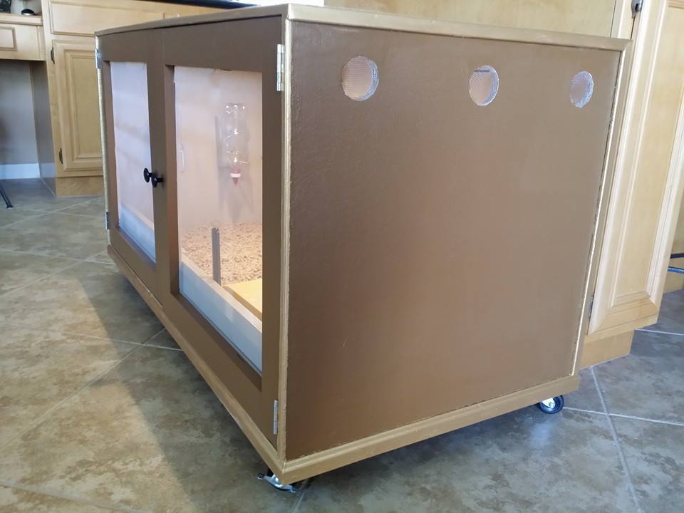 LOL and a potted plant too...lol.....only in Cali.. No just kidding really.My friend built me this in home brooder box! It turned out just like a piece of furniture!! It looks BEAUTIFUL!! We painted it brown and gold to match our living/kitchen area which is Egyptian themed.