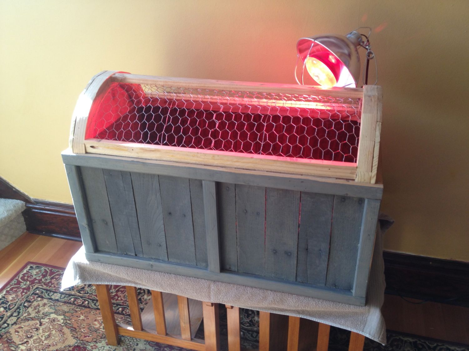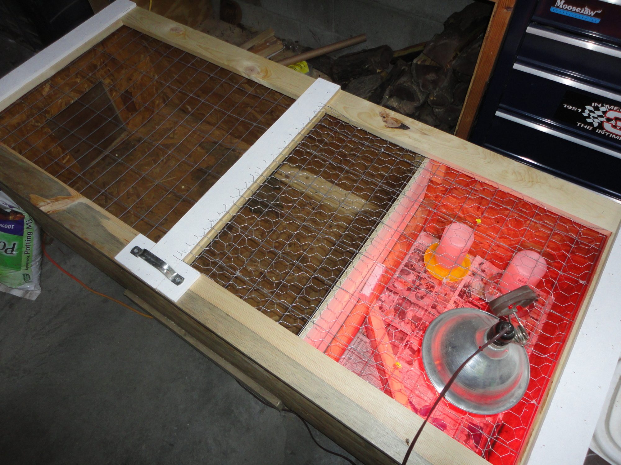 You really want your lamp to hang as straight down as possible.we will have 8-10 in there for the first 4 weeks or so. The temp in there (says the thermometer) is around 87ish… After they are feathered out some, we plan on using a large wire framed dog kennel for a couple of weeks until it is ok for them to go outside. I've heard that you should watch them and adjust for the temperature control but i also heard that you should set up the environment for a week or so prior to their arrival. I hung the thermometer on the wall inside the box. The bulb is a red 250watt. I was recommended to get that one by a few people.