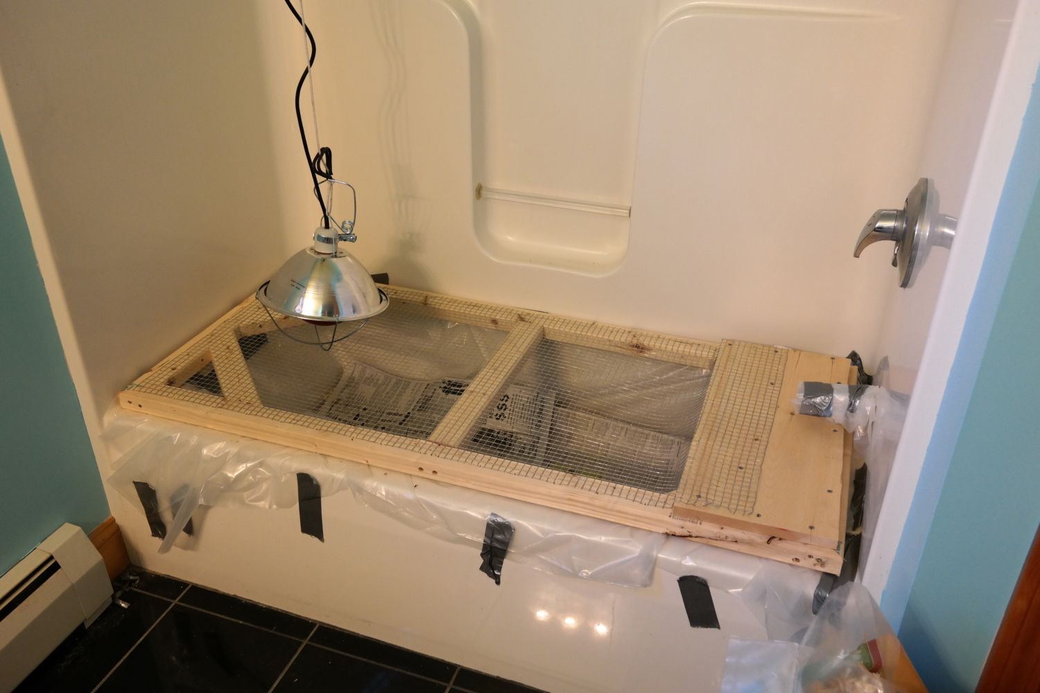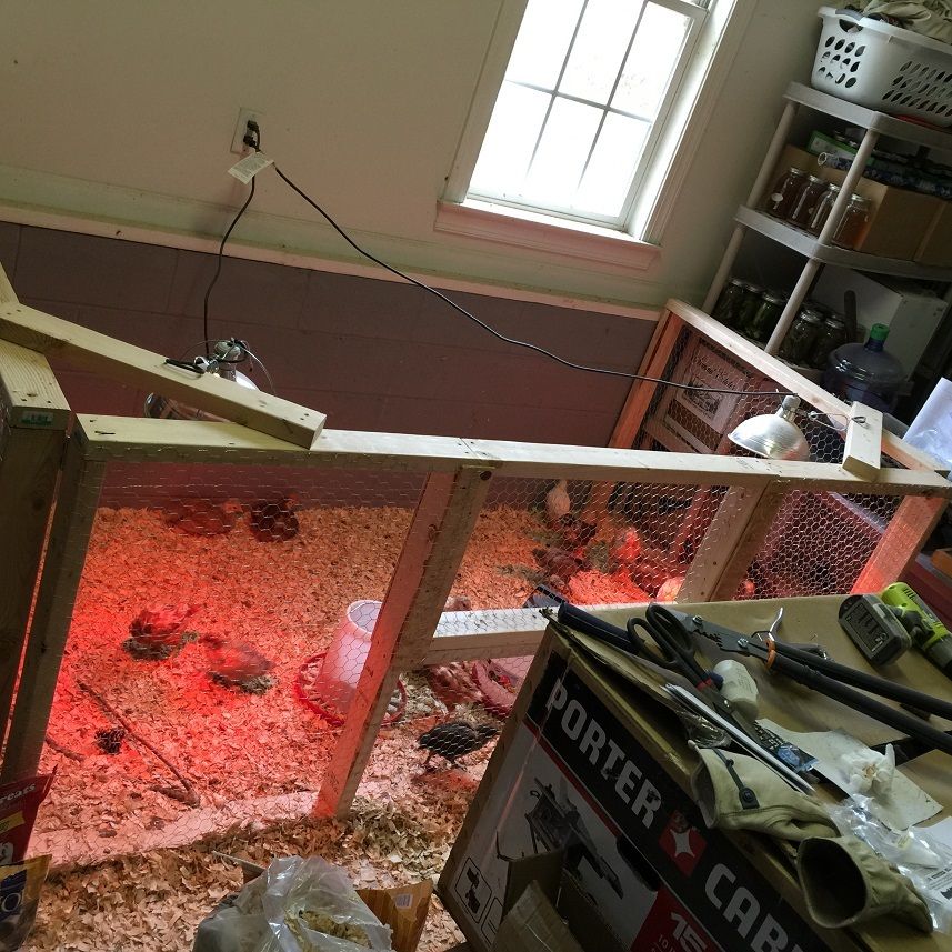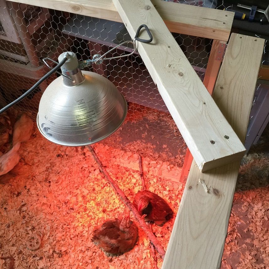 Our brooder is very simple... Since this is a temp shelter until they are big enough to move outdoors we followed a progression from week-olds until about 3 weeks and upgraded. The first Brooder was for 16 chicks and was a fairly large horse trough. Two weeks and change later we had 15 chicks (RIP McNugget) and upgraded to a 32 sq ft brooder pen.