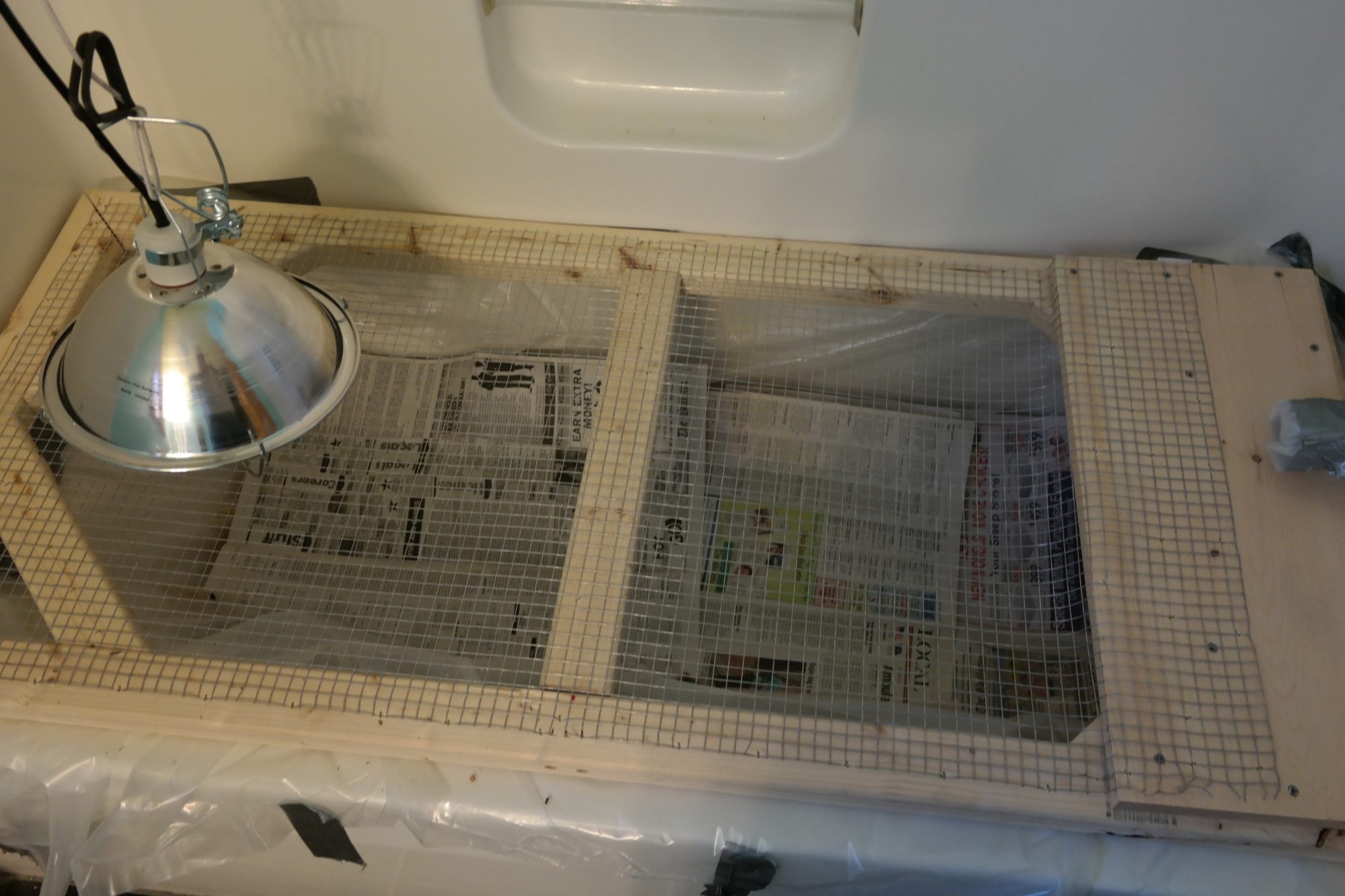 Simply put, I took a 7/16" sheet of osb sheathing and built a foldup, 3 wall pen around it. The side panels are 4' long and the main panel is 8 feet long. The vertical legs are 3' high and sit between the base and top plates. total height is 3' 3". There is a 3' removable panel in the middle of the main panel that allows easy stepover access. the side panels are held square and tight to the edges of the OSB sheet with short cross braces that also serve to support our heat lamps.