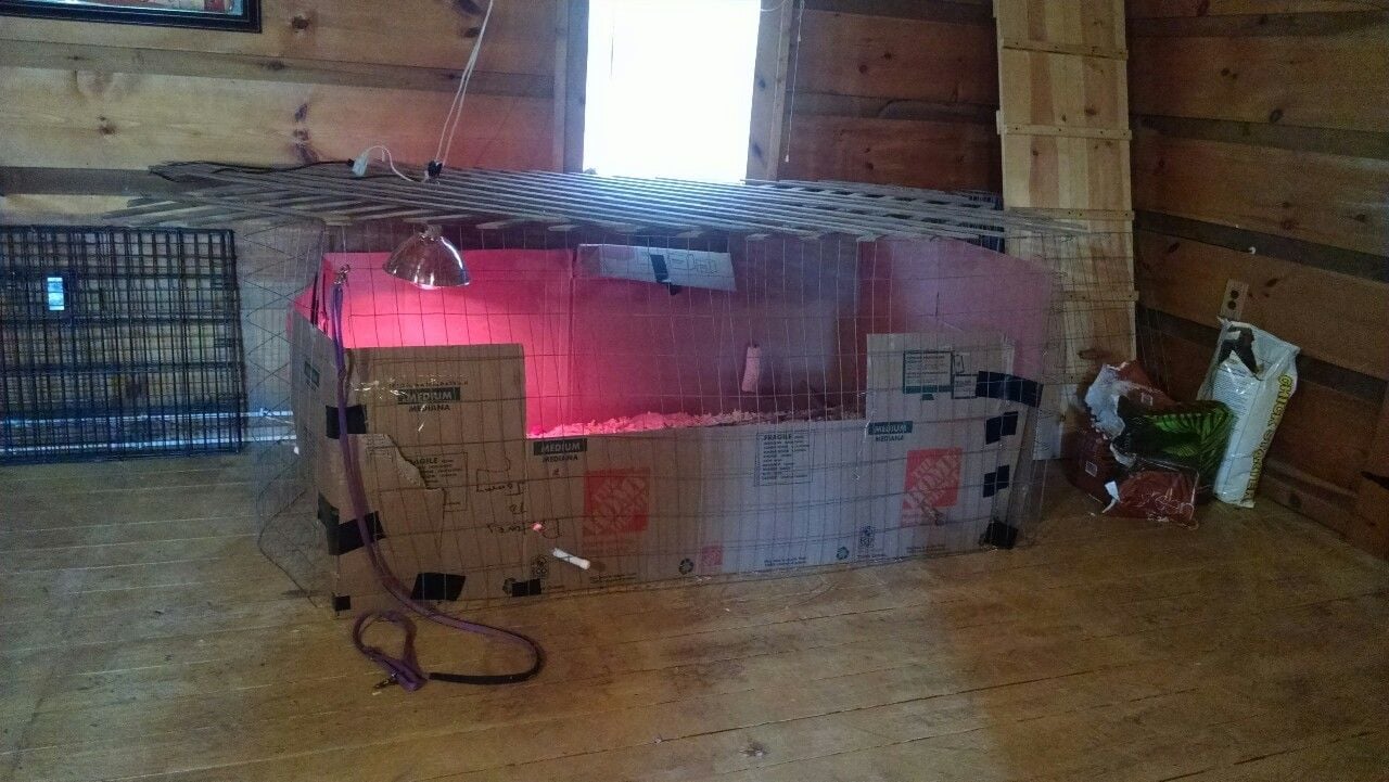 Ok don't laugh at me, but I read somewhere online that cardboard boxes make the best brooders because you can add onto them. Well... that isn't exactly what we did but we did have tons of cardboard and a lot of gorilla tape and various bits of fencing I washed (for fear of any bird poo on them, and some how we wound up with this. The lid is the only thing we could find and don't worry it was very well tested by shaking, throwing things on top of it, and bumping the box around (I've been trying to figure out a different system for a lid to no avail -_-, I didn't think about that when I made this thing so big). I used puppy pads on the bottom and pine shavings on top of those... they dislike letting them lay flat and pretty.