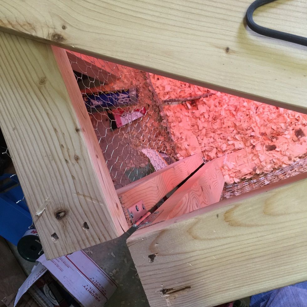 The beauty of this design is that when the kids are ready to move to their new coop=run that's under construction, the brooder will fold up and with the plywood take up about an 8' x 6" floor space against a wall until ready for use again.