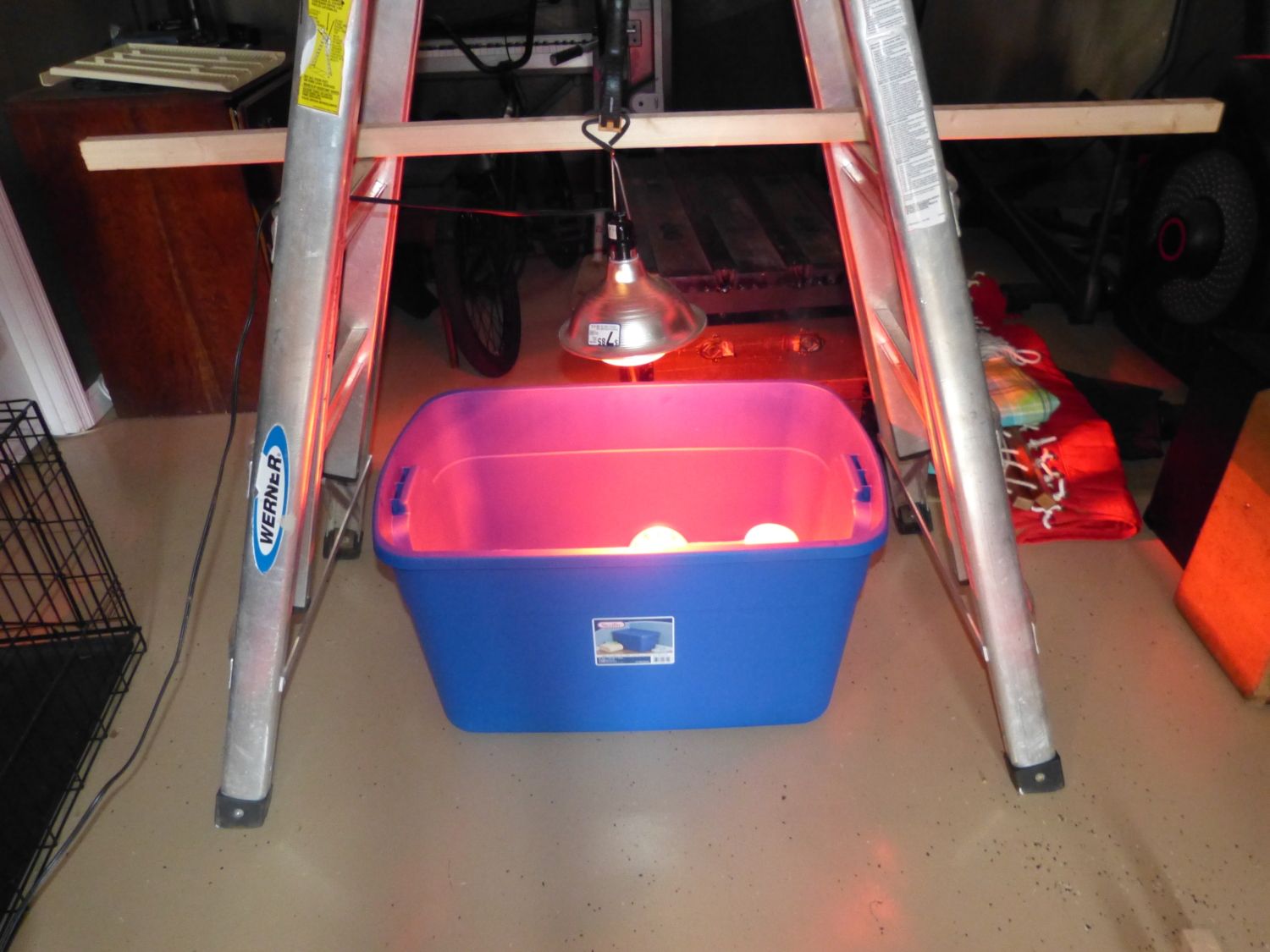 My other worry would be the plastic laundry basket over the heat lamp. If nothing else the plastic could begin to off-gas from the heat of the light but in a worse case scenario, the basket could melt. I see that your thermometer is in the center of the brooder. Do you know if the other end of it is cool enough to give them a spot out of the heat?
