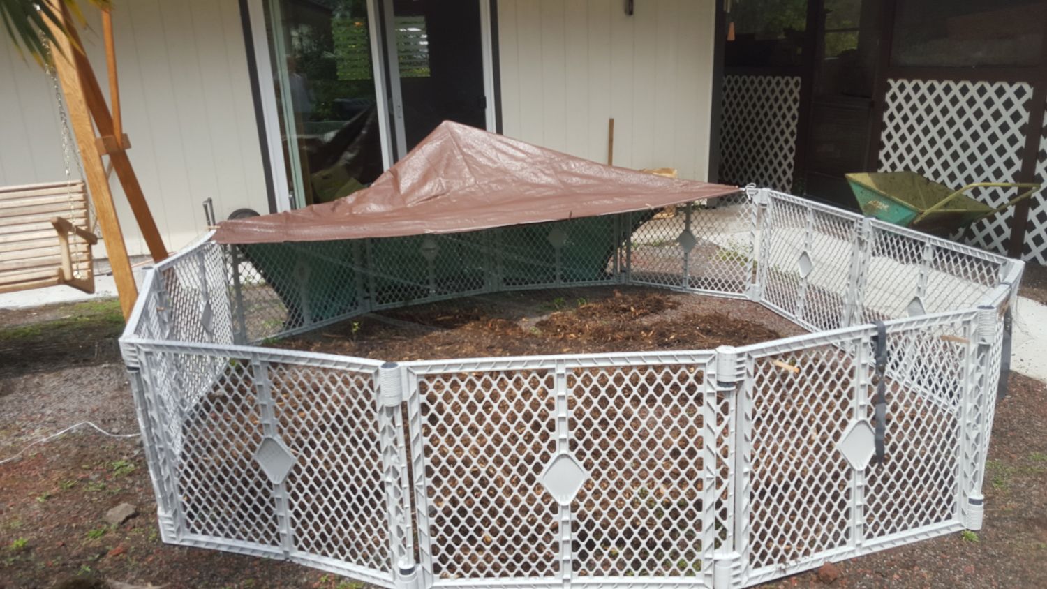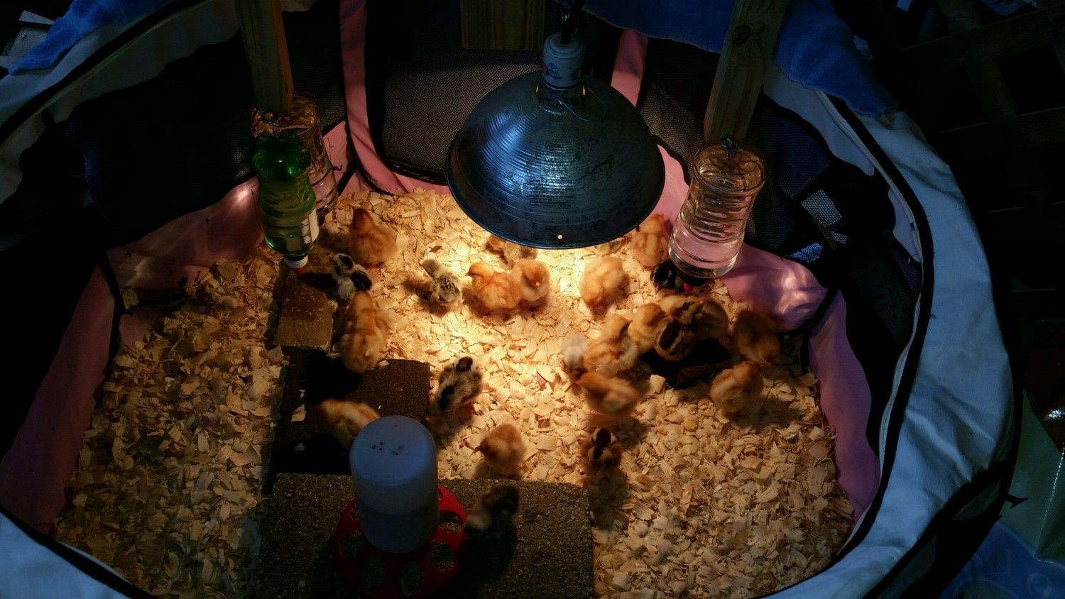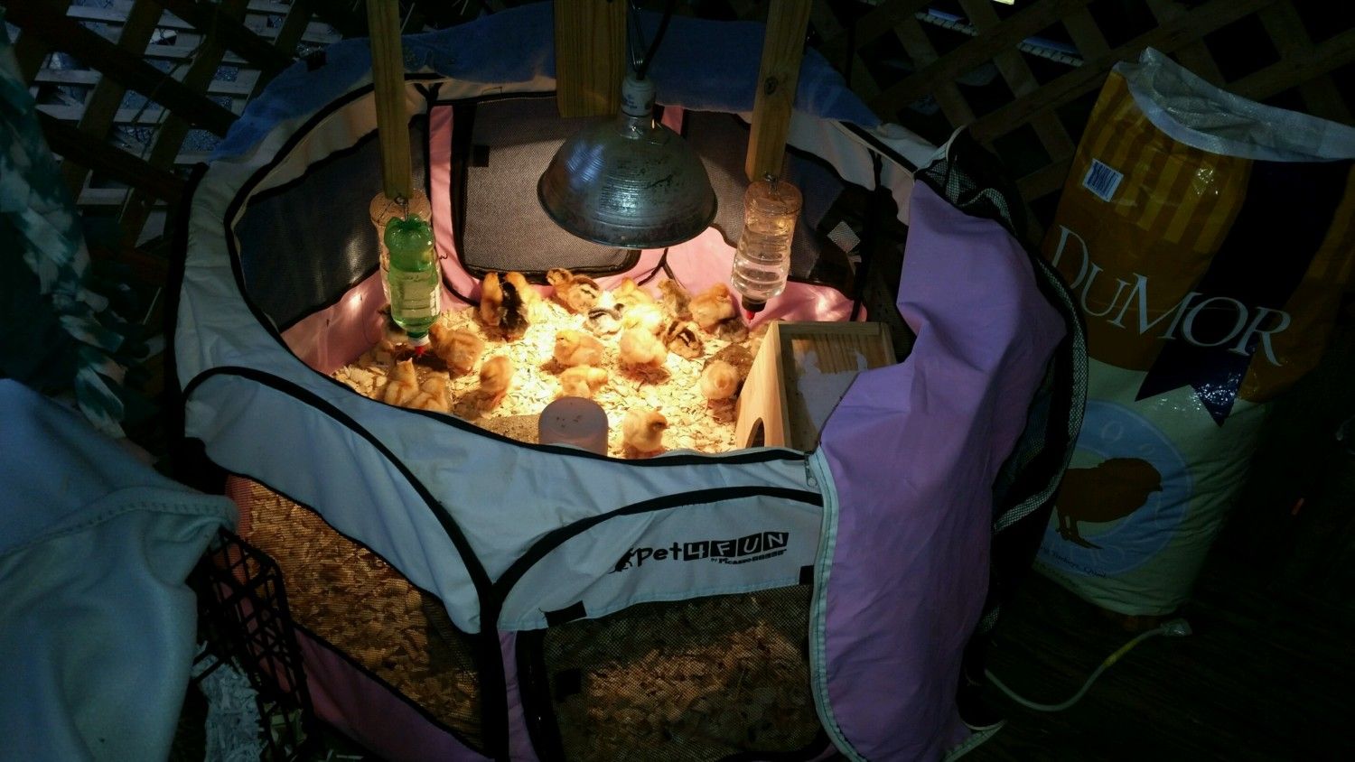 I use two baby pens hooked together. I use a tarp over one side with the heat lamp and heating pad for the first couple of weeks. Then they both are turned off. Over the top I use deer netting to keep them in and other birds out.