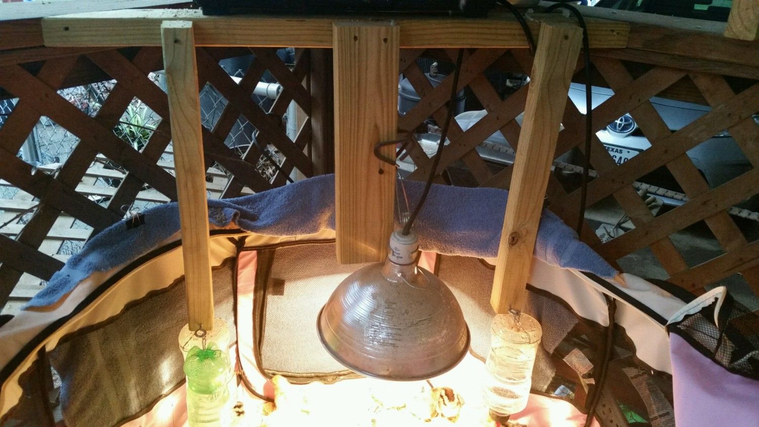 I will have to take a picture of the outside as well. It is in the corner of my back porch, and we screwed a board with two 45's on either end in the corner of the porch, like a brace would be, then we screwed 3 other boards to it and screwed in some eye bolts to hold their water bottles and a screw to make sure the heat lamp does not fall.