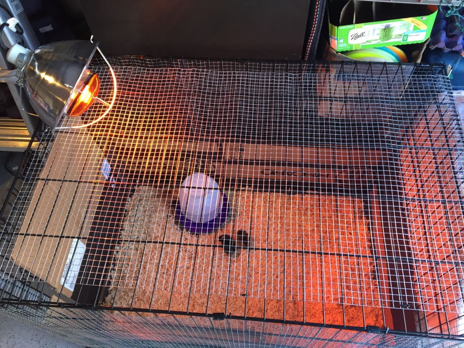 We have 6 sweet babies in here and they seem to be very happy. We have it in the garage, so I have two sides and the top covered with a thick blanket. *NOTE: I later moved he heat lamp inside the kennel after temping.