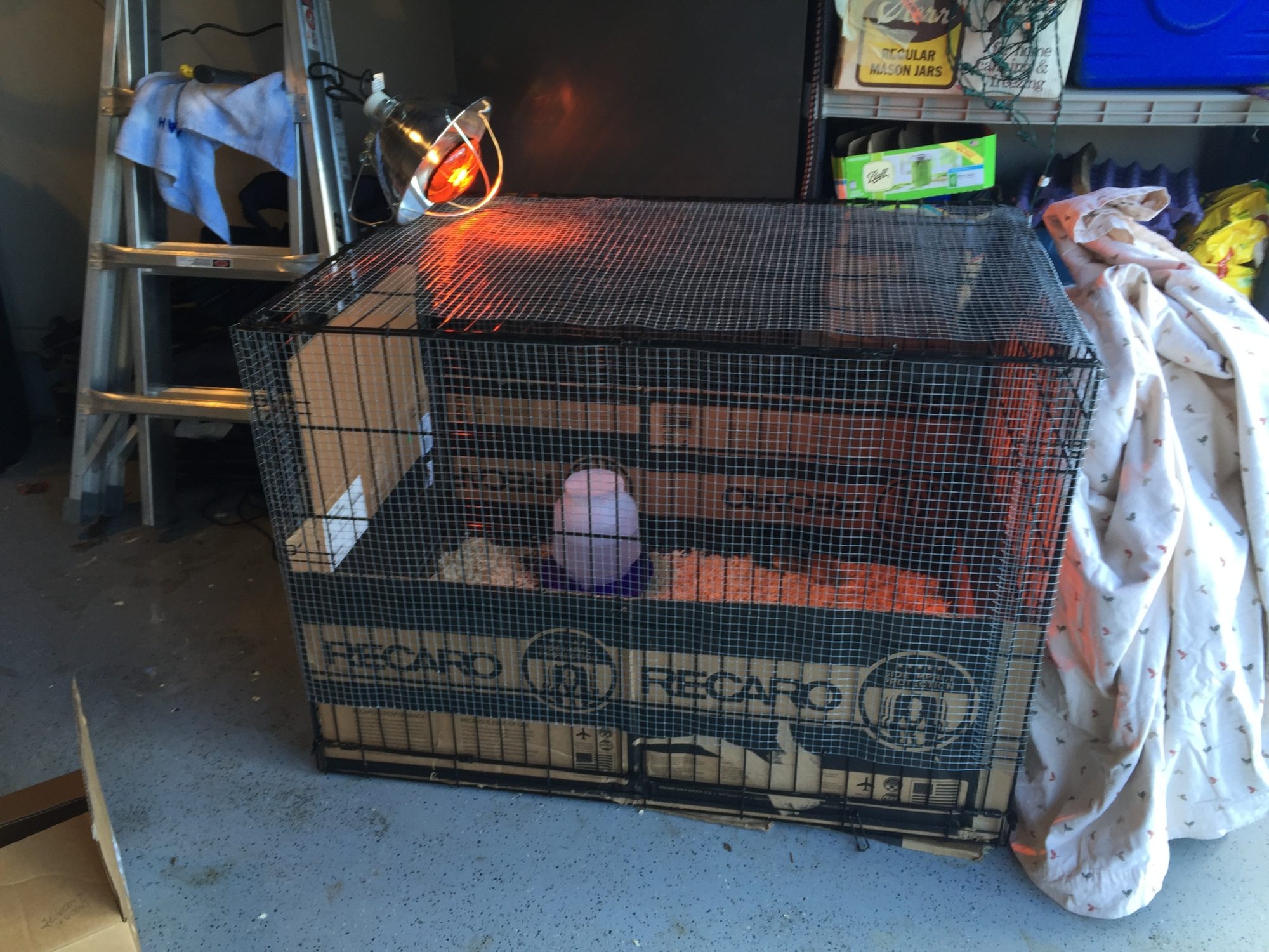 I got excited when I saw that people had used an XL dog kennel for a brooder. I happen to have one in storage. I covered it in hardware cloth and used cardboard up the sides for extra warmth and to keep the shaving in.