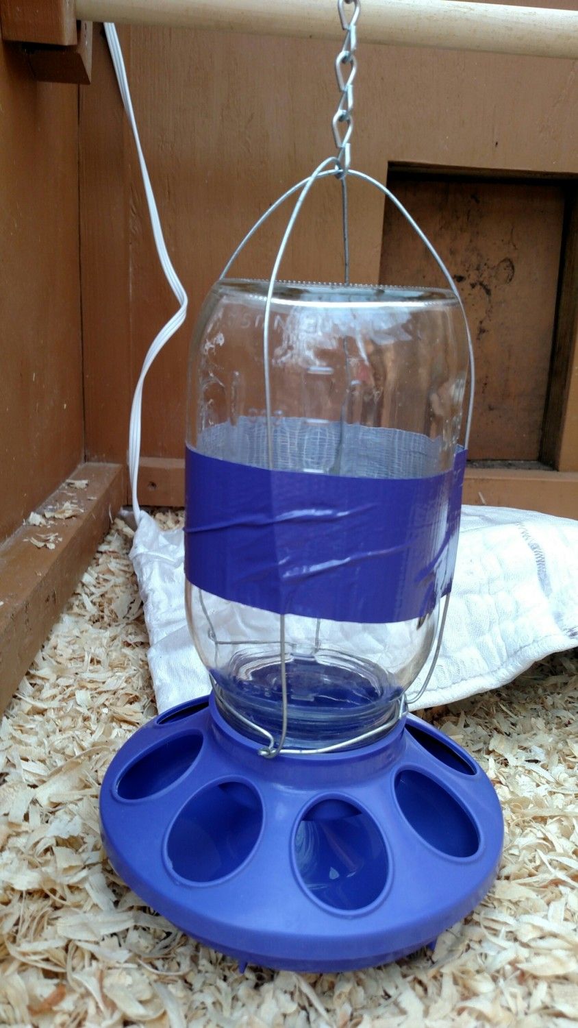 Can you imagine the mess if this were an open waterer?! My water is on the same kind of chain so I can raise it as they grow but it's a 128oz juice bottle with a nipple in the lid. Ocean Spray makes really nice, squared juice bottles. I just made a hanger much like this one and poked a hole in the bottom to prevent a vacuum. It even has a handle for easy filling. Perfection.