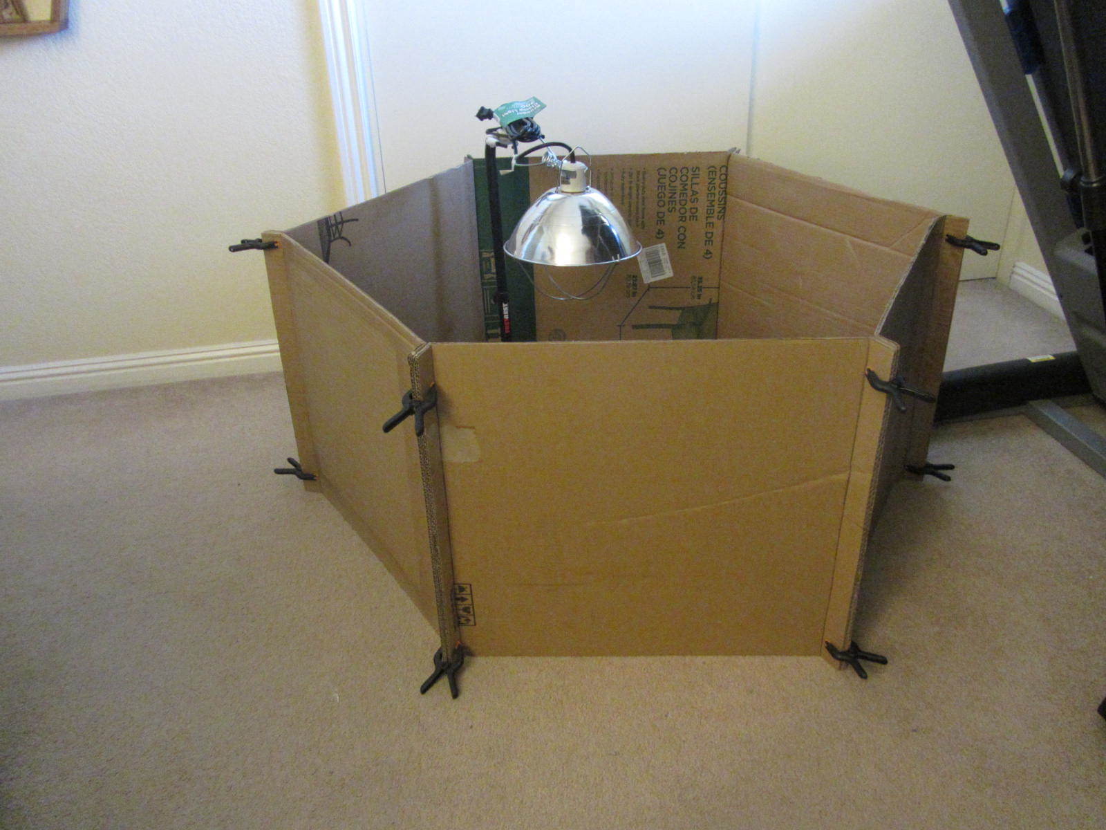 I just recycled some cardboard and made 21 x 25 inch panels and clamped them together with Harbor Freight clamps. I got a free Tarp from Harbor Freight for the bottom. Heat lamp is clamped to an adjustable guitar stand with Satco 175W red heat lamp. Probiotic and Electrolyte packs from Sav-A-Chick for the water container. Food container and Thermometer to keep track of heat. There are additional cardboard panels to add as the chicks get older and additional food and water dishes. Newspaper and shavings will be added onto the tarp. This is a great method for bonding to the chicks because you can remove a panel easily and approach them from the side. Most other brooders, you have to appear as an aerial predator and approach them from above.