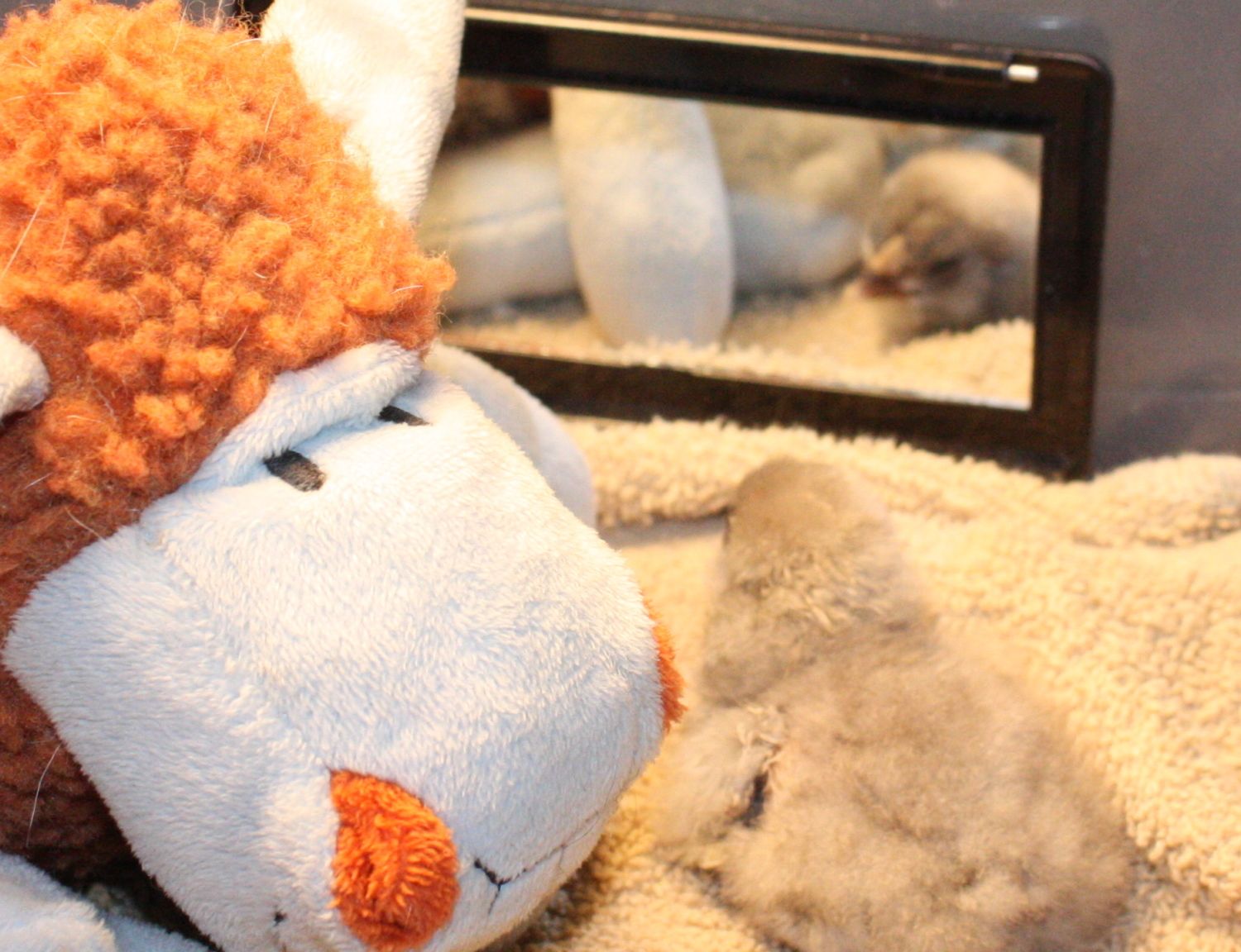 This little one was a late hatch from a brood of 7. His brood mates were picked up by their owners at 2 days old. This one had barely begun to hatch by then. He had a hard, assisted hatch. The inner membrane was sticky and had dried over his face, back and wing. After dropper feeding vitamin water and a warm bath accompanied by gentle toothbrush removal of cemented membrane leftovers, he's doing much better. He's fluffed up and walking around. I've seen him eat and drink on his own. Now, he's realized he has no friends. I gave him a stuffed critter and a small mirror which seem to have helped a lot, but any advice is much appreciated. His name is Stinky-Pete.
