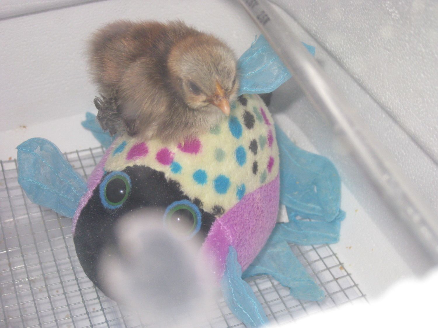 It has been difficult to hear him crying. I let him snuggle in my lap with a feather duster for 20 minutes at a time now and then, and then back to the incubator (brooder) for better warmth.