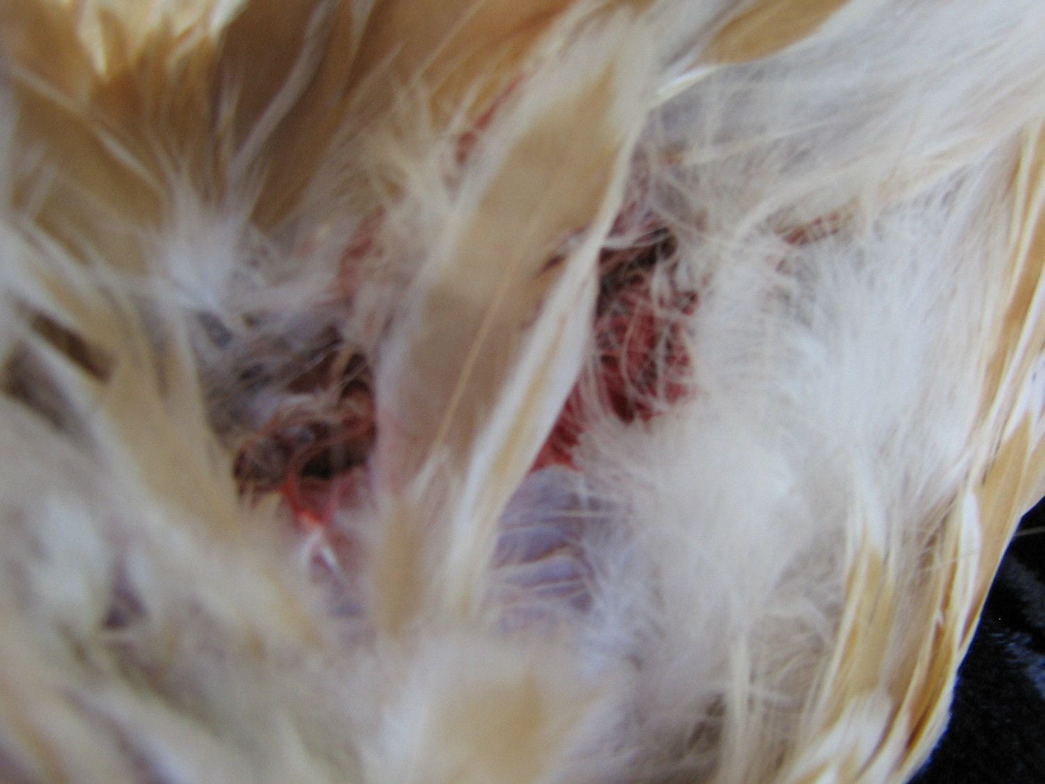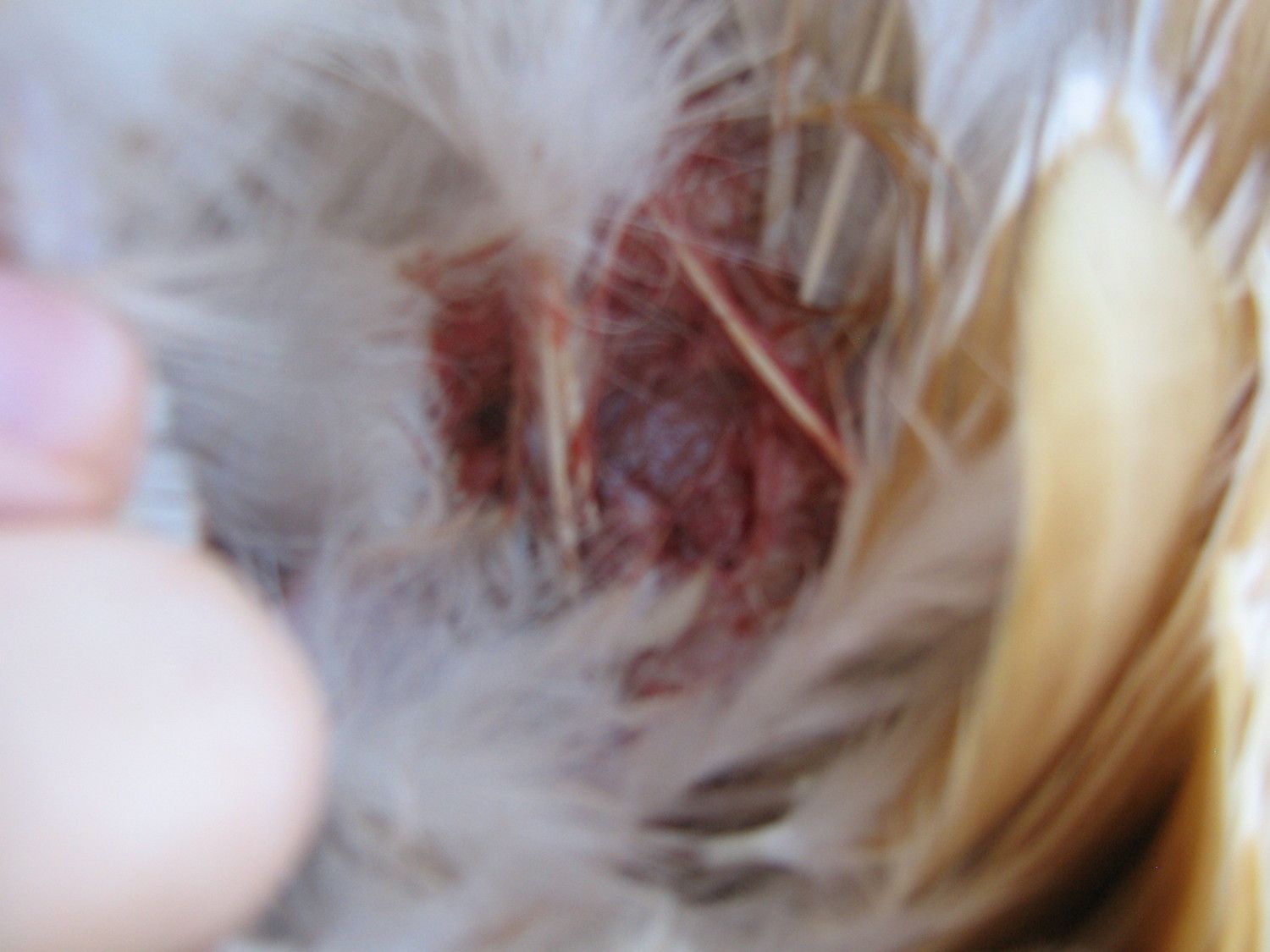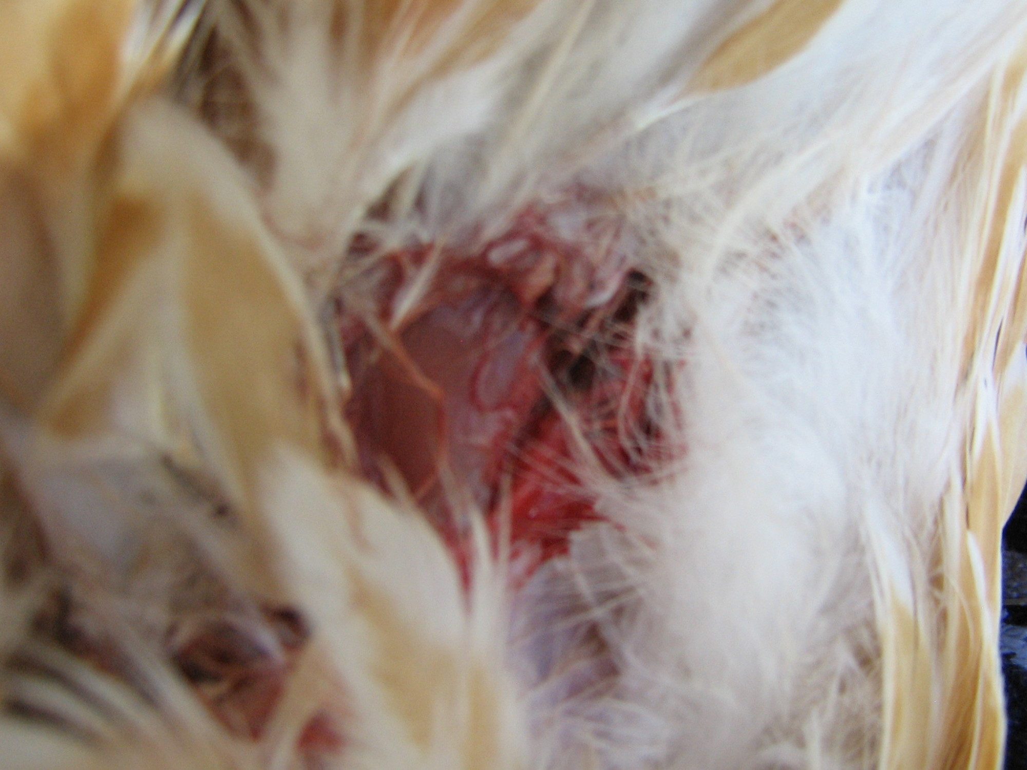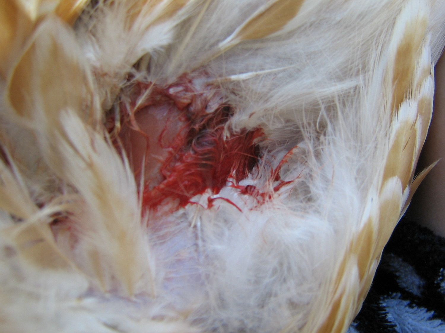 She has two holes in her skin, thankfully not very deep. Right on her shoulderblades. She is pretty shocked, so I returned her back to the chicks and her other broody who was raising the chicks together.
