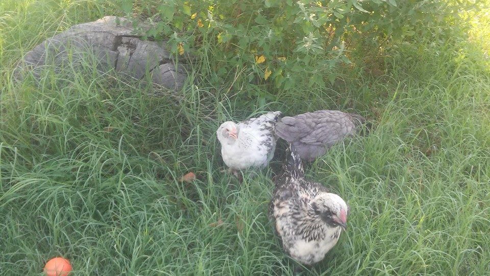A couple weeks ago, I posted about Miss Ramin, our Banty hen going broody again. She hatched out her first set the first week of May. I did not realize she went broody again till the 12th of Aug., so on Sunday we moved her and the 12 of 20 eggs into the house. The 8 eggs that were around her were ice cold, and since I did not know how long they had been out, I tossed them. From my calculations, I expected chicks on Sept 2nd or 3rd. But the chicks had other plans, on Monday night I hear Peep Peep Peep, and a wet baby climbed out from under Mama. Tues, I see a dark gray chick with a off white chest, poked it's head out, and today a yellow chipmunk was peeking out of Mama's wing. Chick 1 is the black on - she is so tiny, could be Banty size. 8/29 Chick 2 is the gray with a off white chest. 8/30 Chick 3 is yellow and peeking out of Mama's wing. 8/31 9 more eggs to go. Chicks doing well, eating drinking, climbing over Mama and each other. Once she is done hatching out eggs, I will moved her to the oversize cardboard box. I was going to move her this week, before chicks started hatching. I had her in the oversize box for her first hatch in May, she never got off the eggs the whole time, not even to go potty in the far corner. This is her 5th hatch in 4 years, and she never moves off the nest. These are Ramin's chicks from May hatch. Nicole (banty size, feathered feet), Chubby (poofy head) That black chick is the big chick in front, in the grass. Baby Picture (L - R) Stormy, Starlight, Midnight Older Picture - Midnight (front), Starlight (left), Stormy (right)