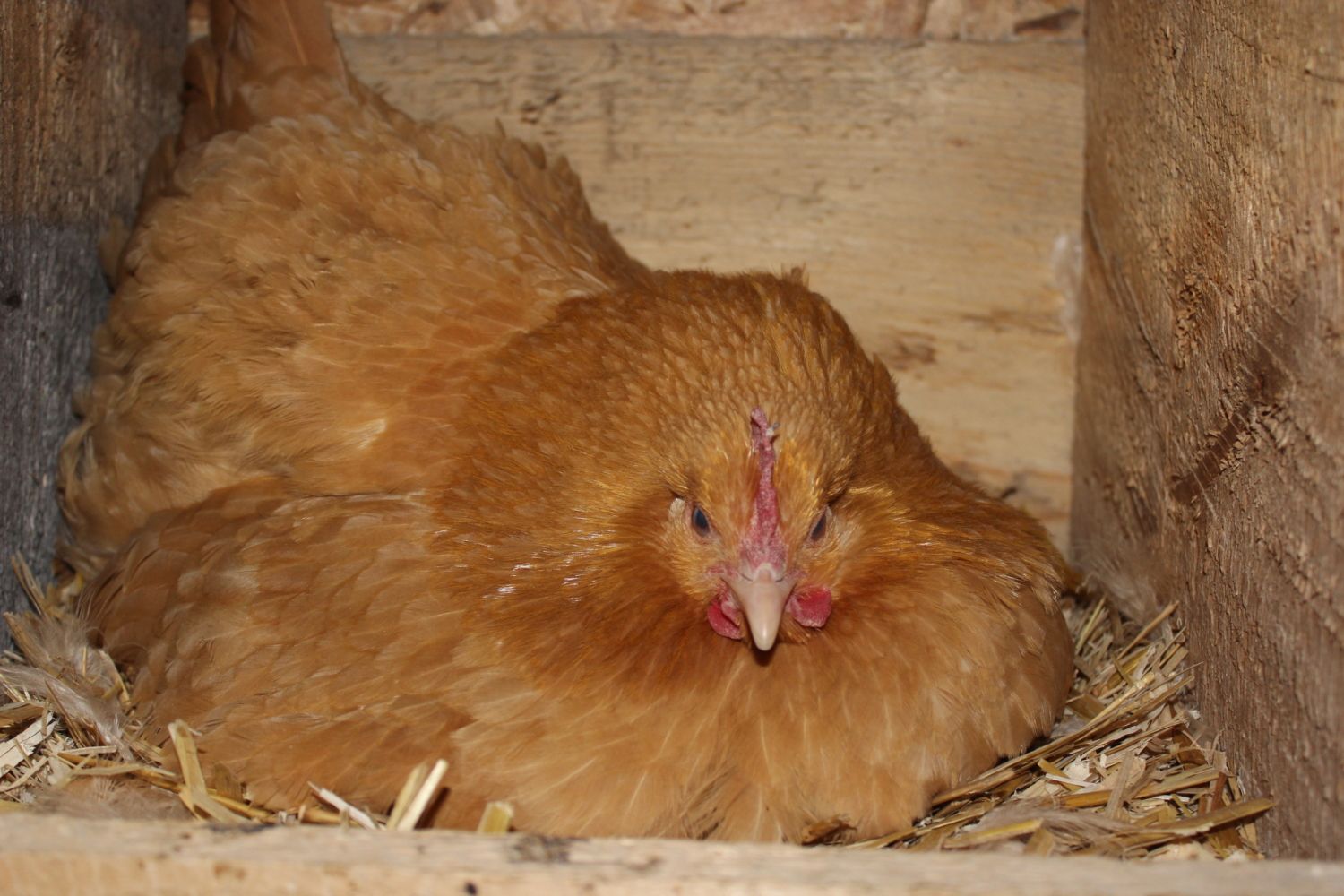 She is in a good brood!Here is my broody, Fluffy. She is an 8 month old Buff Orpington. I noticed her sitting on 4 eggs one day displaying all the broody traits talked about on here! I waited a week to see if she was "serious" and when that week was up I drove two hours to buy her some gorgeous buff, light and dark Brahma eggs! There are twelve under her!
