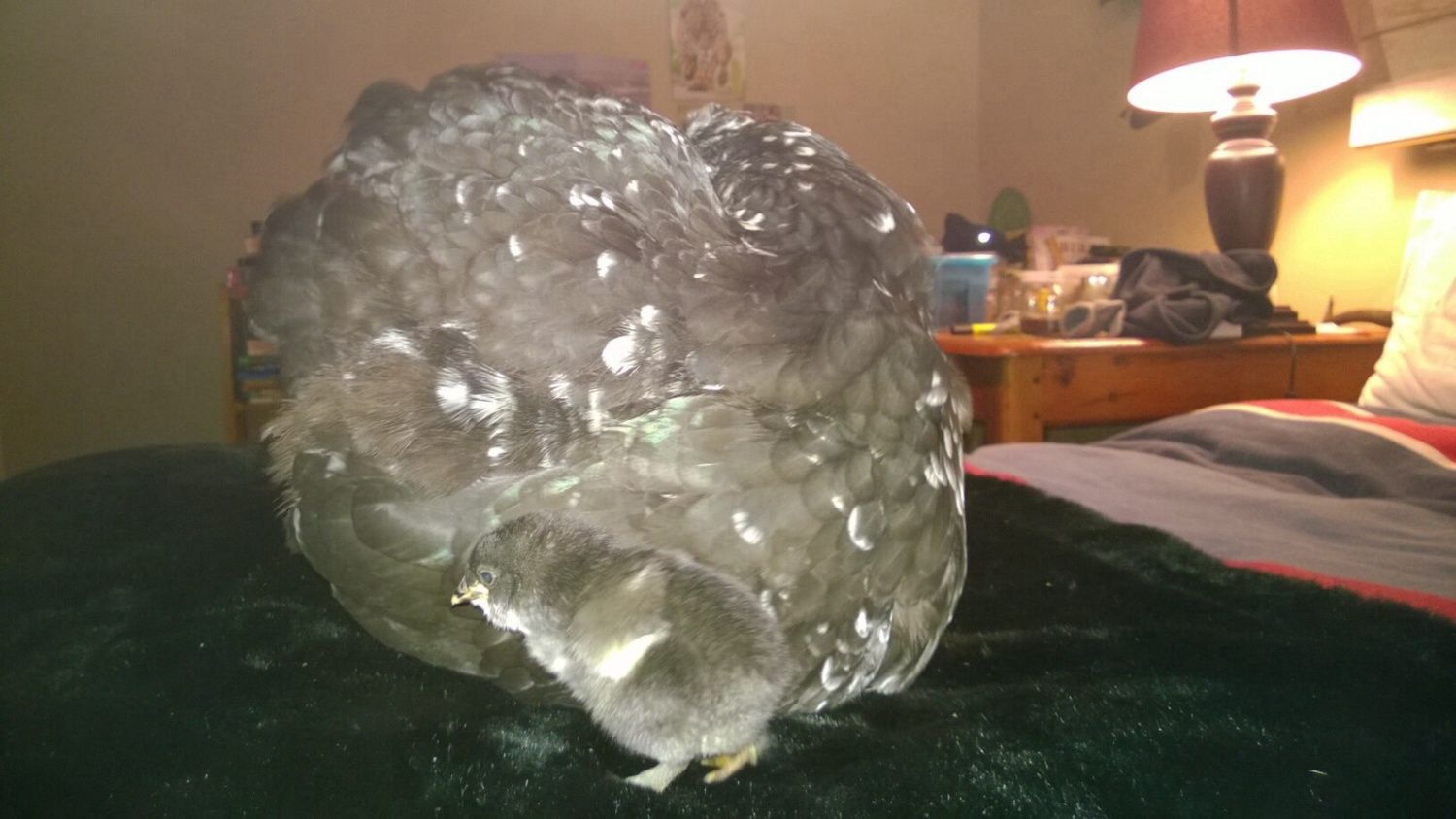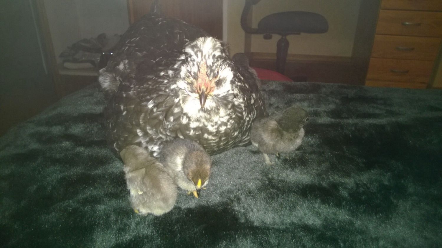 My suggestion would be.... move mama and chick to the floor box...if you reach under her (carefully) and get ahold of the chick you can move it to the floor box... mama will follow! Trust me! LOL