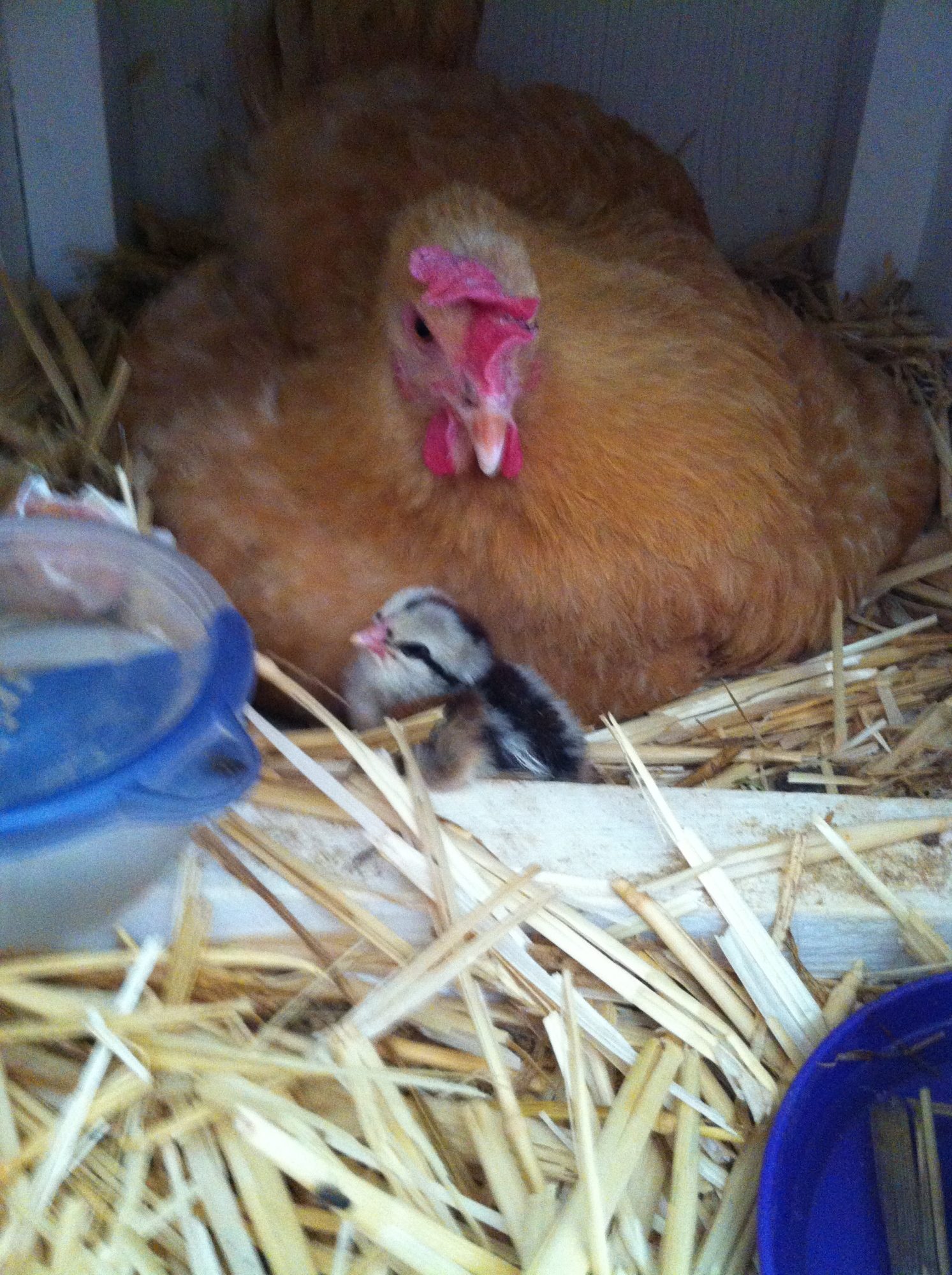 And here is my friend's broody hen that hatched we put some of my eggs under. The eggs actually came from the above girl, and my rooster who is a blue red crow wing. Out of 7 eggs, 6 hatched, so not too bad at all