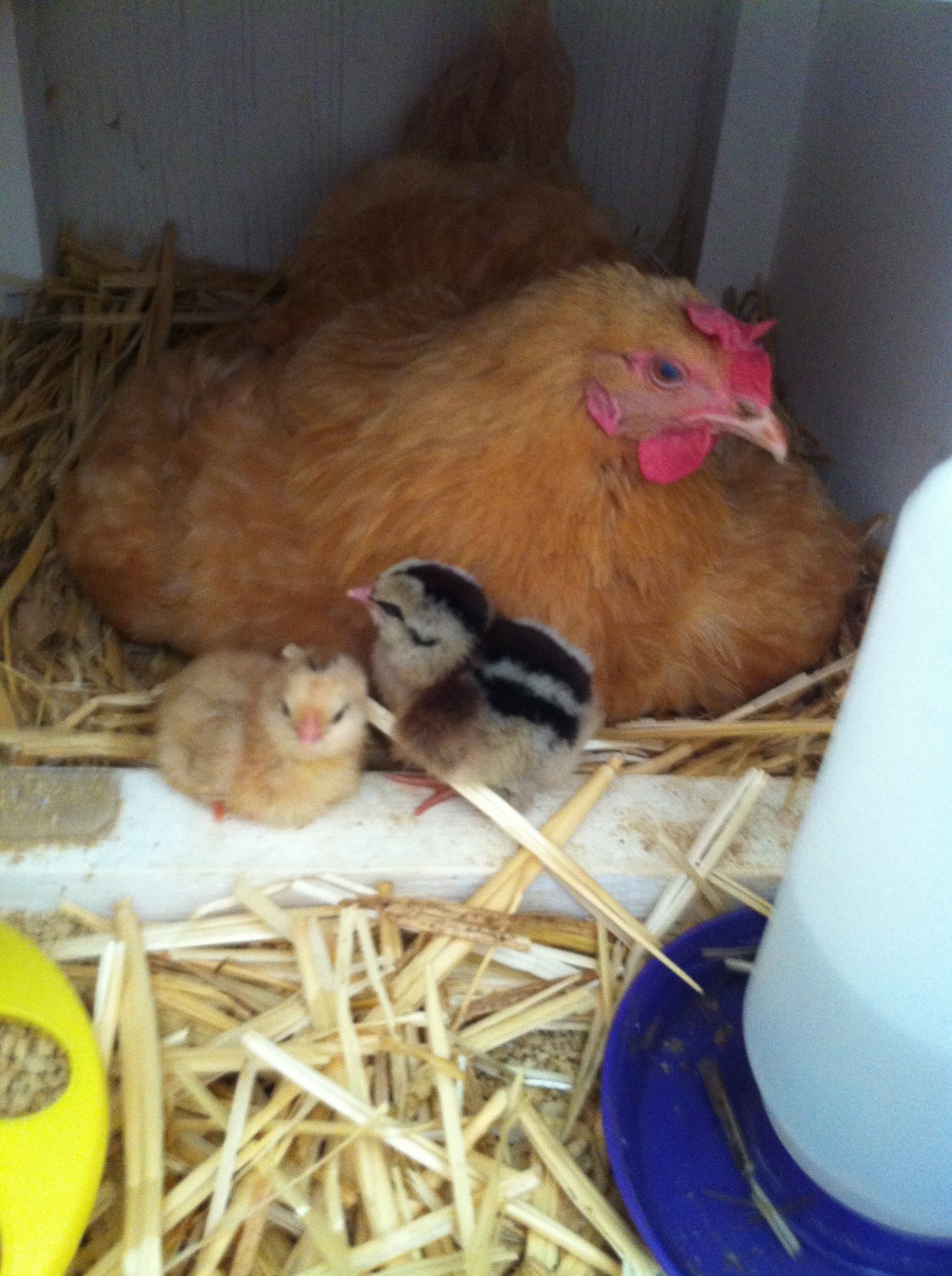 My broodies decided to tag team and raise their chicks together. At one point they had a broody "duplex" and the chicks could decide which hen they wanted. I'm sure by now the babies are completely confused as to who their momma is.