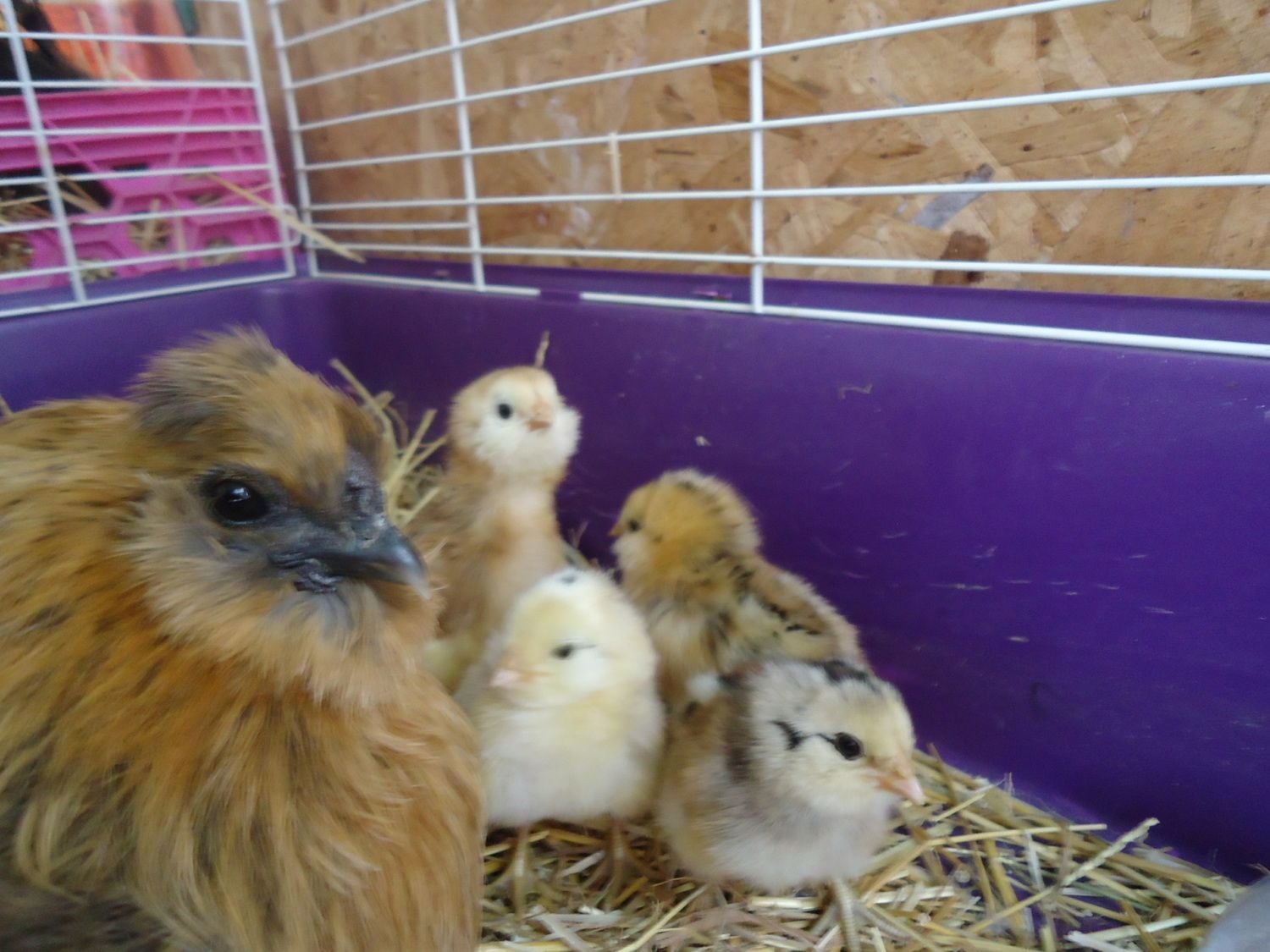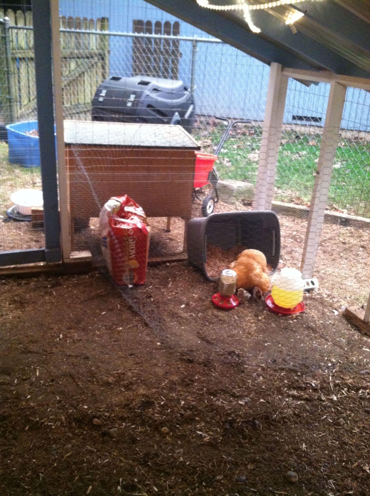 Well my chicks kept stressing me out, living in a rabbit hutch with mama. They couldn't figure out how to leave or get back into the hutch (weren't yet following mama everywhere) so inevitably someone would be left in the hutch or in the run....peeping VERY loudly. Goobers. So I removed the hutch and ramp, threw a bin in there on its' side, and that's their new shelter.