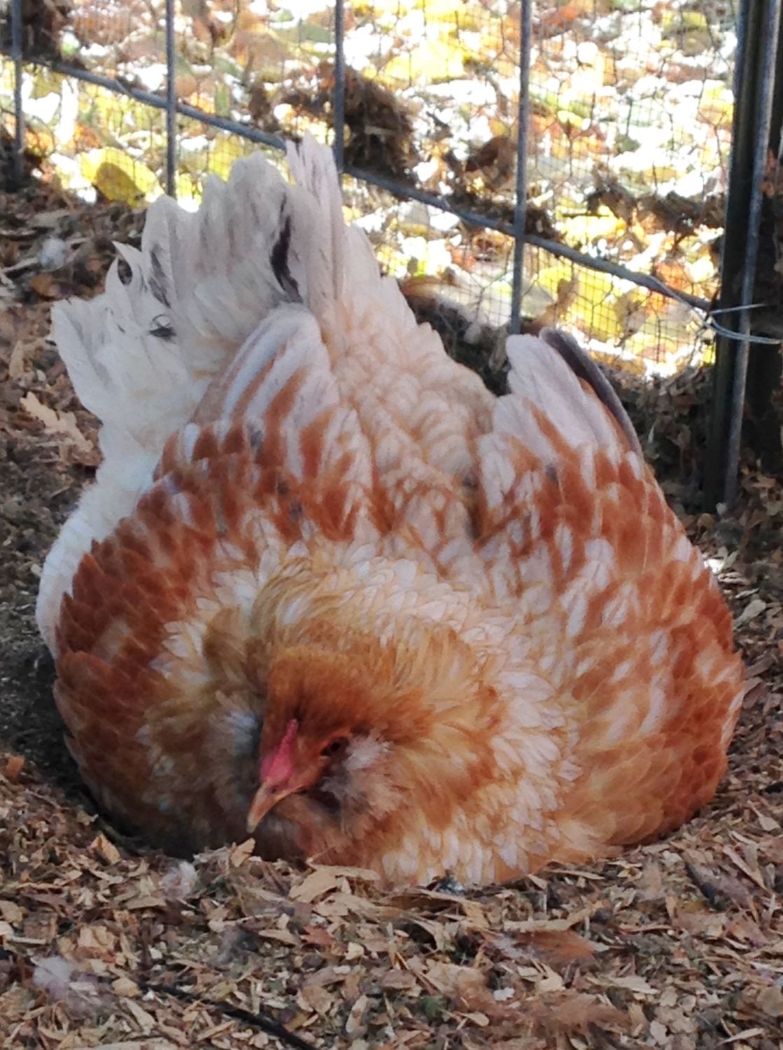 I am sure she hates to go back to the bottom of the pecking order. It is just that she is really annoying when she is not broody and most of my chickens and my Muscovy can't stand her. She is a misfit... not sure what to do with her. I would love for her to go broody again. I have some duck eggs that could really really use a mommy! Should I stick her in a dark dog crate for a bit and see what happens? I think she is fine nutritionally to go broody again. She is a Salmon Faverolle... here she is with her grown up babies. Look at that little frizzle hen looking up at her mama!