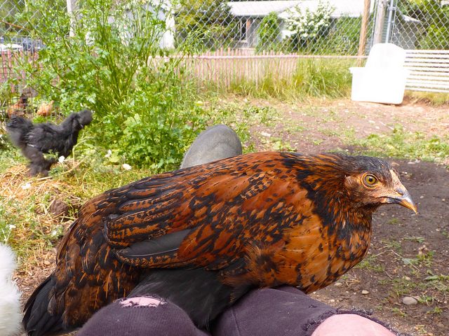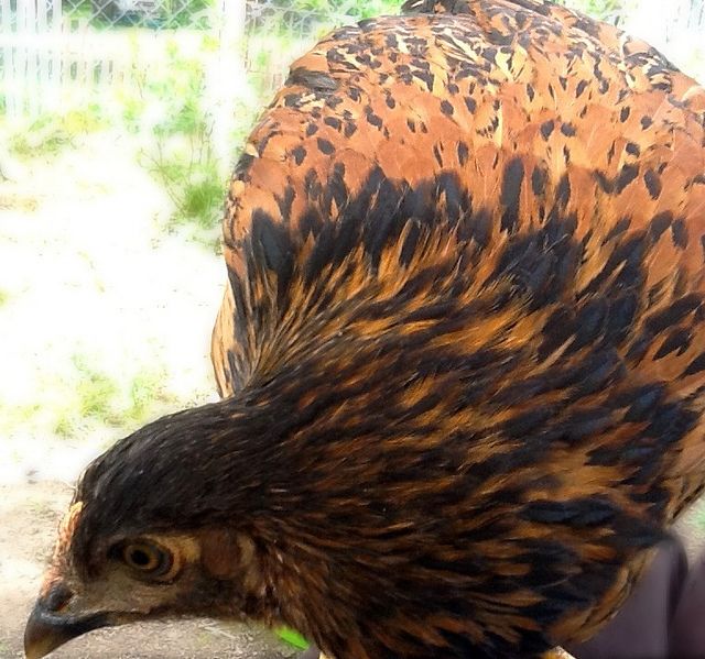 About 11 weeks old here, purchased as week-old chick from the "some of my chickens were in one pen during a cold spell" selection. The breeder had, among many others I didn't see, Black Copper Marans, Light and Coronation Sussexes, and American Game Fowl.