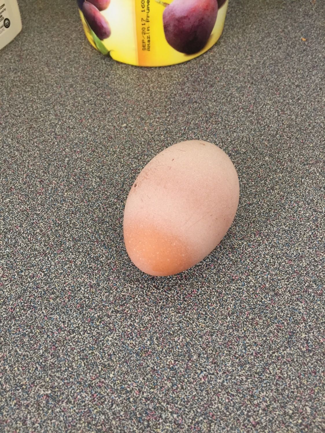 This egg was just removed from the regrigerator. The darkish end was in the egg carton.