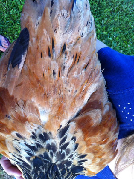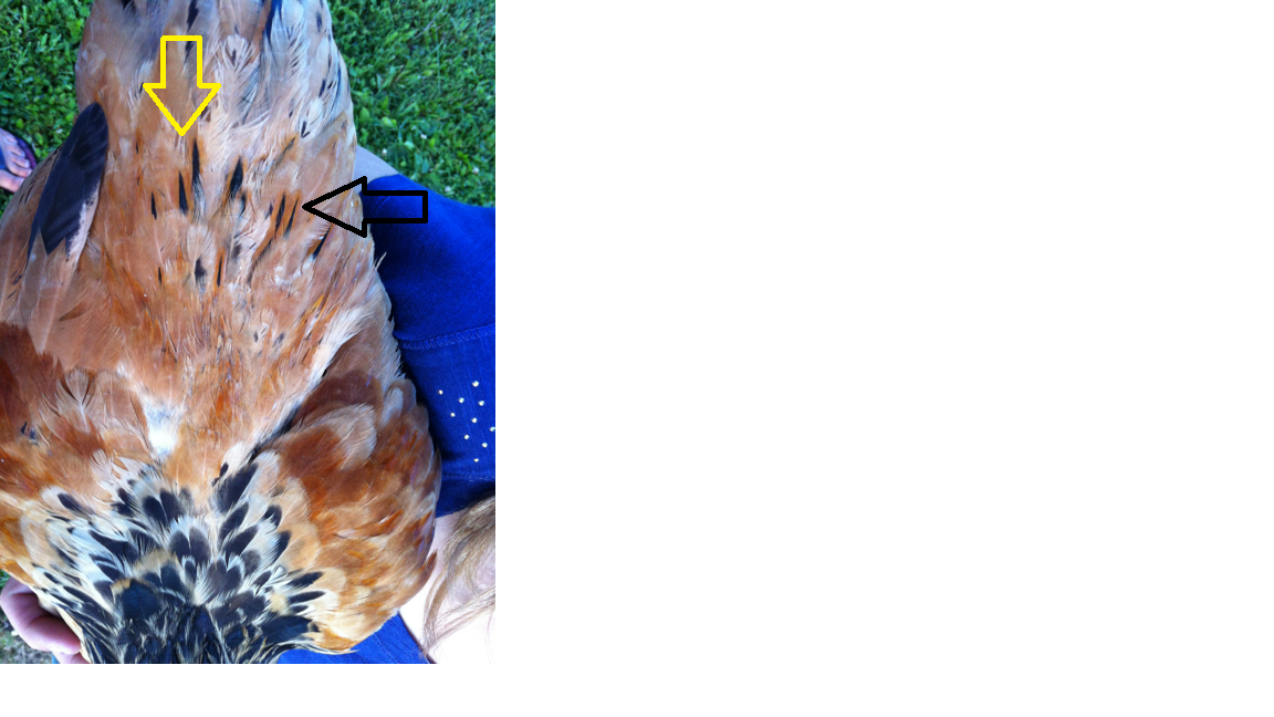 Saddle feathers are Shiny Pointy feathers that develop in the back of the bird.I'm new to chickens and I have a brahma. Dumb question, what are the saddle feathers?