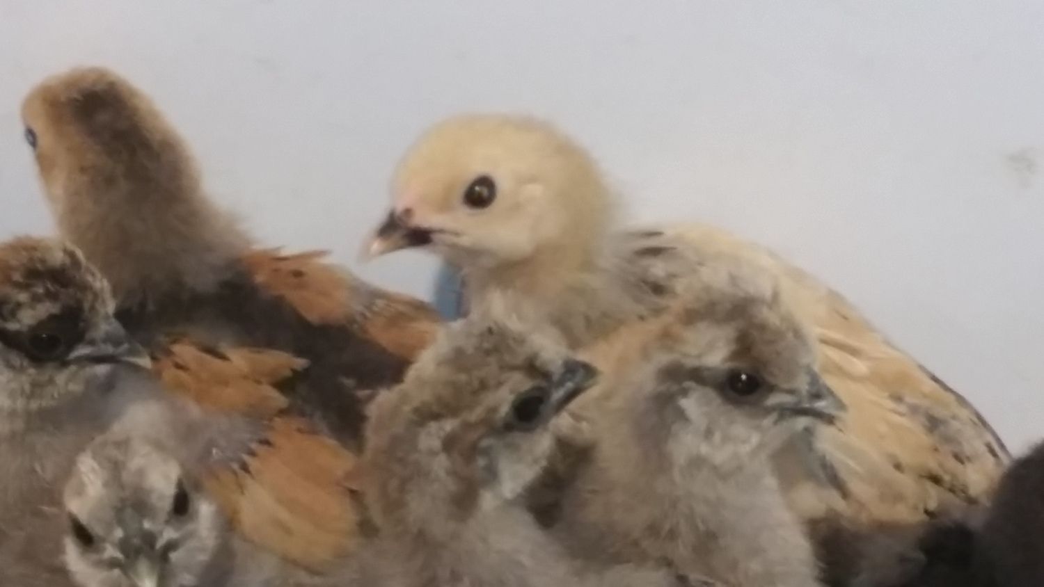 I have 2 surviving buff brahma chicks from 3 that hatched. I think they are about 5 or 6 weeks old. One is a soft brownish color, the other is redish with a black stripe along it's spine and white patches on it's shoulders. Here's a bad photo. They are the 2 chicks that are furthest in the back. I think the girl is on the right, looking at the camera and the boy is in front of her, looking away. There is no noticeable comb development yet. The rest are a bunch of silkies that were trying to get in the way. Am I right that one is a boy, and one a girl?