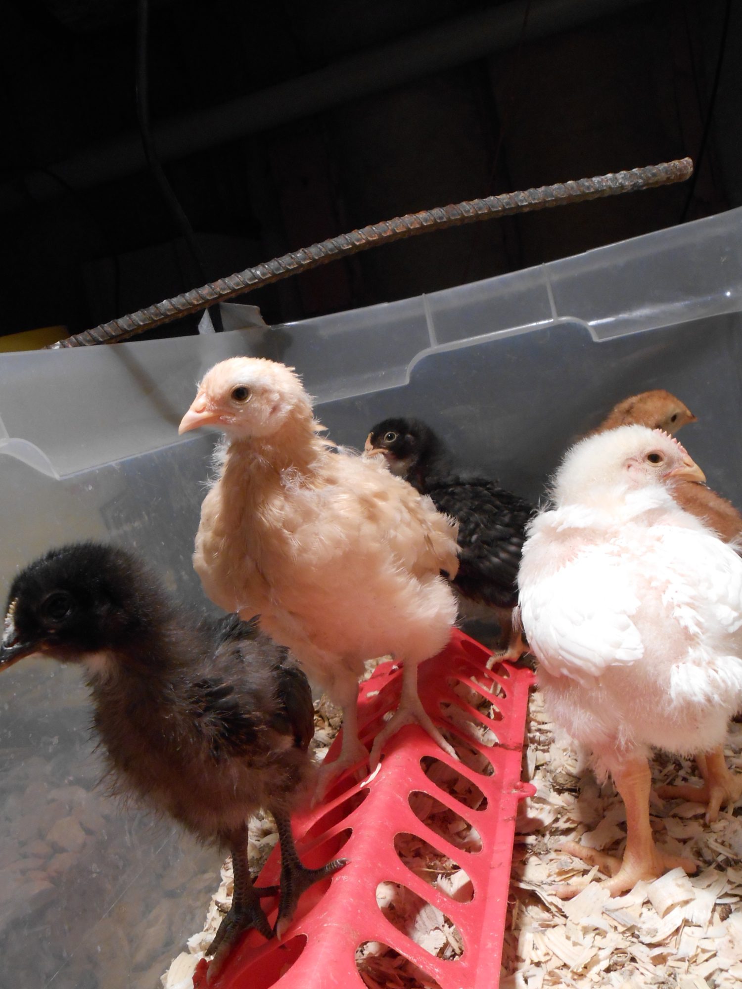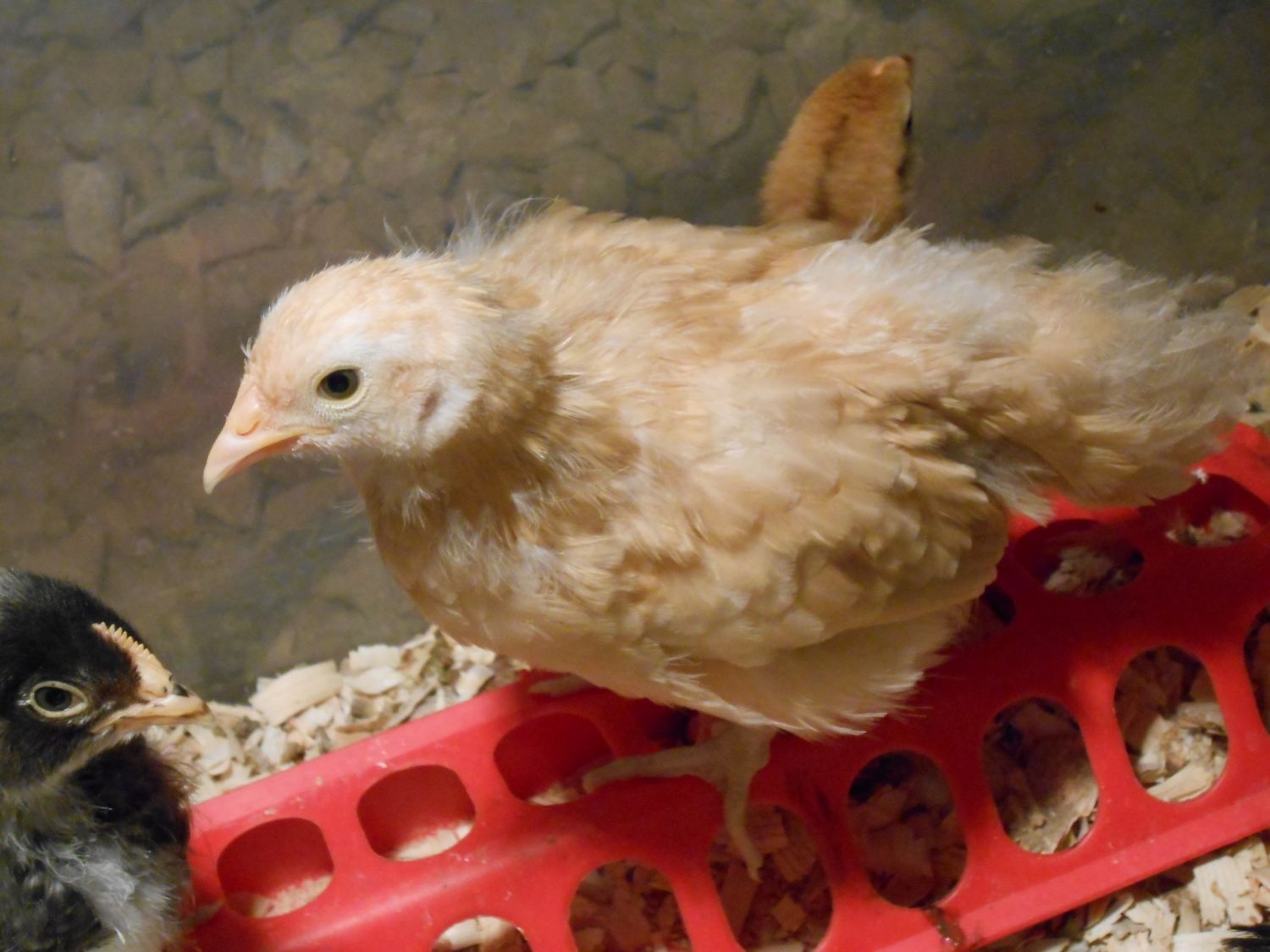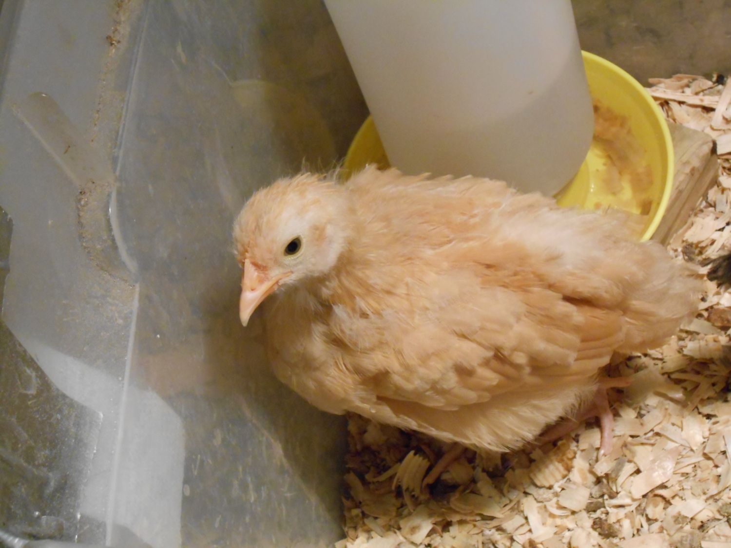 This is Buffy, s/he is about four to five weeks old. We have one Cornish X who has a big pink comb already, although no wattles. Buffy and the other chicks, besides the Cornish x, don't have much of a comb at all. We are hoping pullet on this one, any guesses???