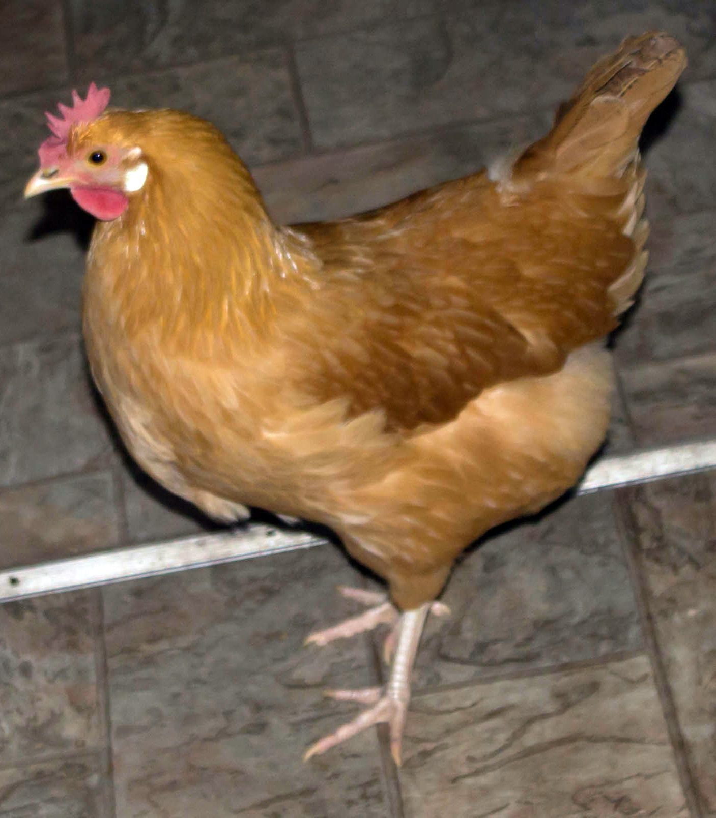 We've been trying to figure out what our Maddie is to.....we ordered a Buff Orp and got her instead. The gal I bought her from got the batch she was in from a hatchery. not sure which one,and all the other Buff Orp's she ordered turned out true to form except our Maddie. She is a slender hen, not large and fluffy like an Orp. She has that white patch by her ears, and she lays white eggs. Maddie is just about 1 year old now. There is some solid black on her tail and a little black striping that may not be really evident in the pictures I'm attaching. Whatever she is, Maddie is very personable, her comb has gotten pretty large and sometimes it leans just a little bit to the side now, not all the way down though....though its not as huge as some I have seen.