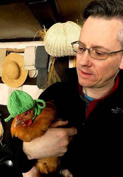We have 4 buff orpington girls that we just love. After a bit of frostbite on combs this winter each had a hat knitted for them for extremely cold nights, and each is in a different color. Today hubby posed with Hannah the hen, the sweetest one ever! She just loves attention and to be held and sit in our laps! I snapped these pictures!