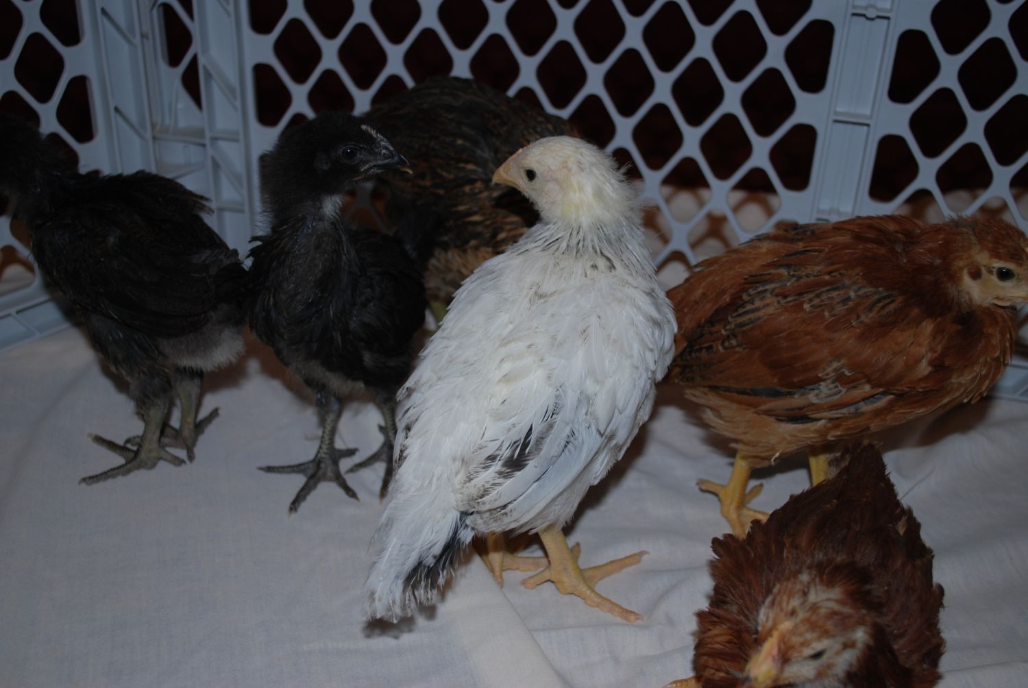 We have a question about one of our chicks. Dusty was purchased as a buff Orpington. Now that she (hopefully) is feathering out we are pretty sure she did not come as advertised. Does anyone have any guesses as to what she really is? Dusty is the white bird in the middle of the pack, she's about 5 weeks old now. It's not the greatest pic, we can take a better one if necessary.
