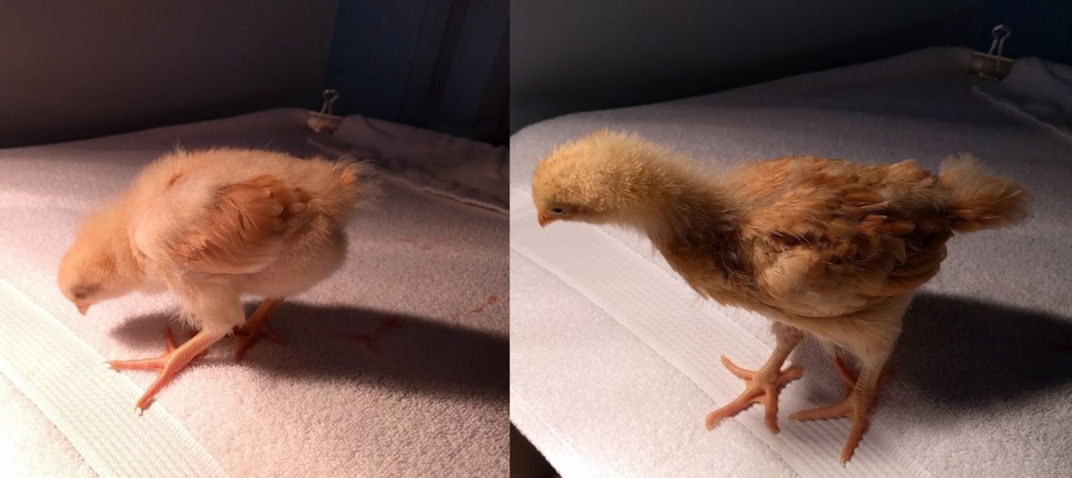 Here is a picture of Pax next to one of the other buffs that is developing normally; they are three weeks old: