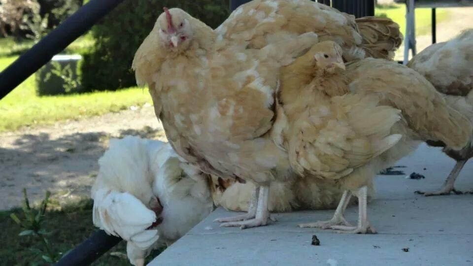 The crotchety old Nugget with her younger, ailing "sister" (they are from related lines), Hope. Nugget was threatening my broody BR hen outside her pen so you can see in the 3rd photo her dropped shoulder. Wish you could hear her growling, LOL. Nugget is going on 7 years old. The bantam Cochin is Xander, who tries his best to keep them in line. Epic fail! She's molting so her color is "patchy".