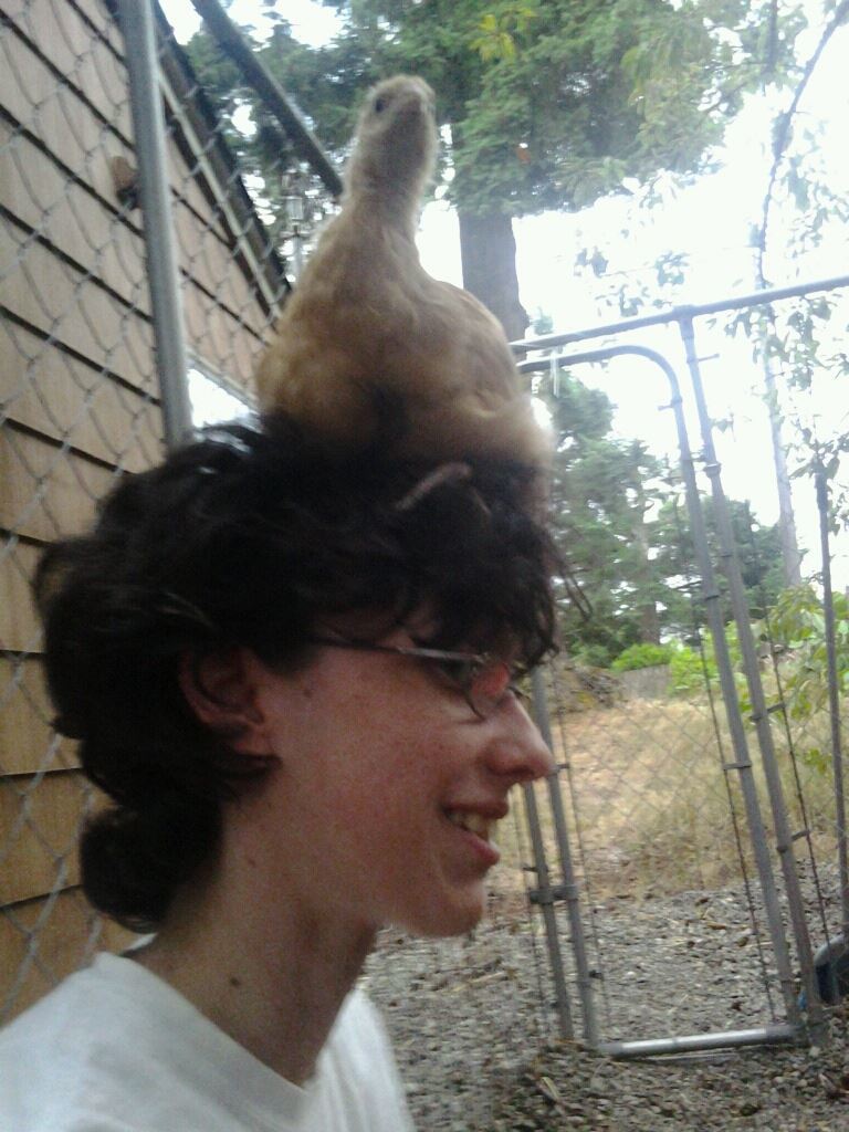 our buff has been the friendliest and most outgoing of the bunch, and decided early on that she loved perching on shoulders and heads, nuzzling hair, and getting pet. these pictures are from when she was younger, but they're my favorites of her to be honest.