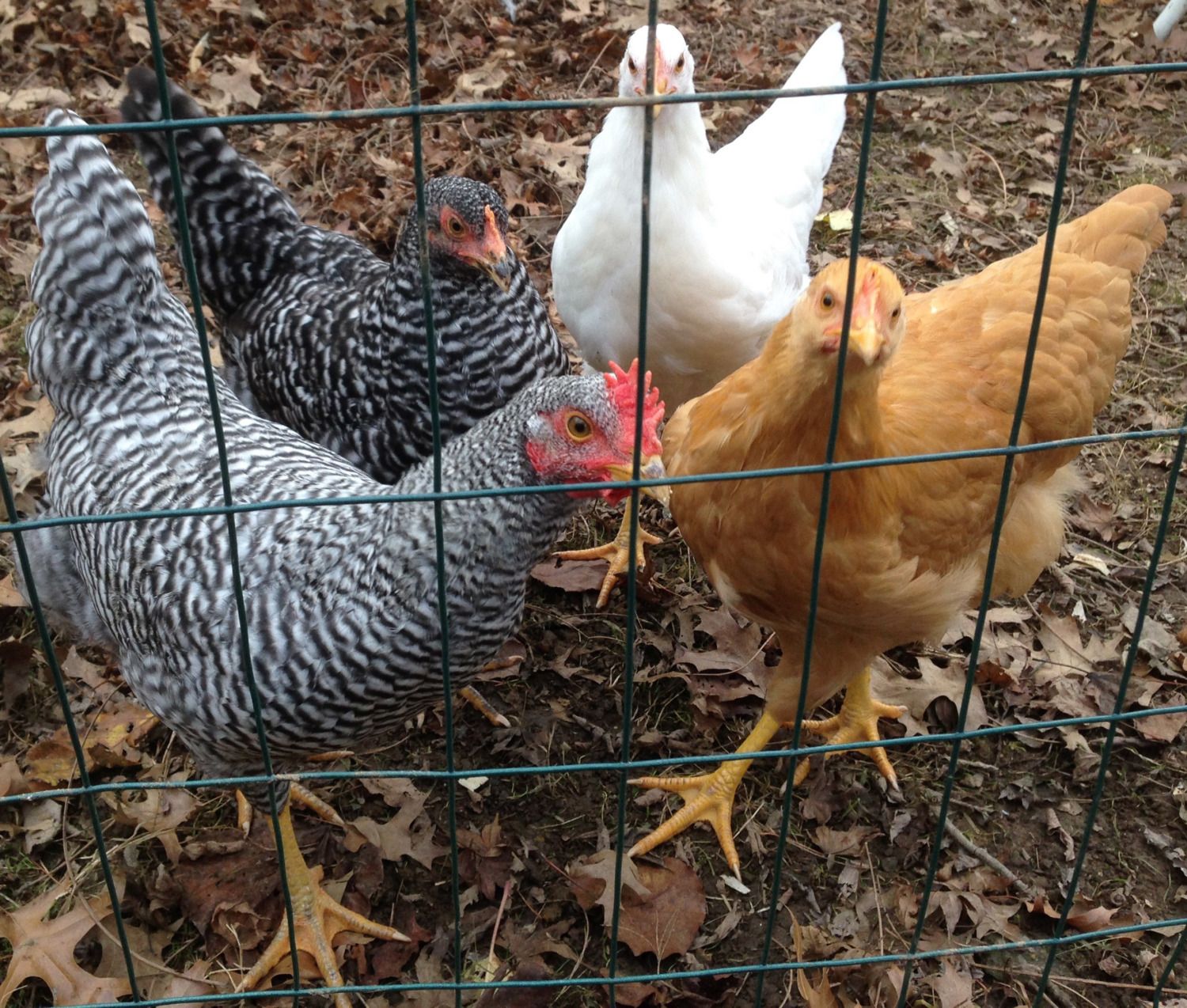 That is Daffodil with the yellow legs on the right. (I am looking for a good home for my little barred rock 'roo--who was supposed to be a girl!)