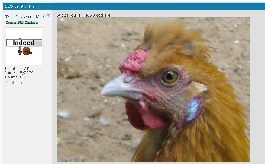 the following cross rooster is name Bubba(and Kaput his sister but only shown as chick on this example) Bubba belongs to : The Chicken´s Maid. poster she/he was kind enough to post these birds for all of us to learn from it and I thank her for it.