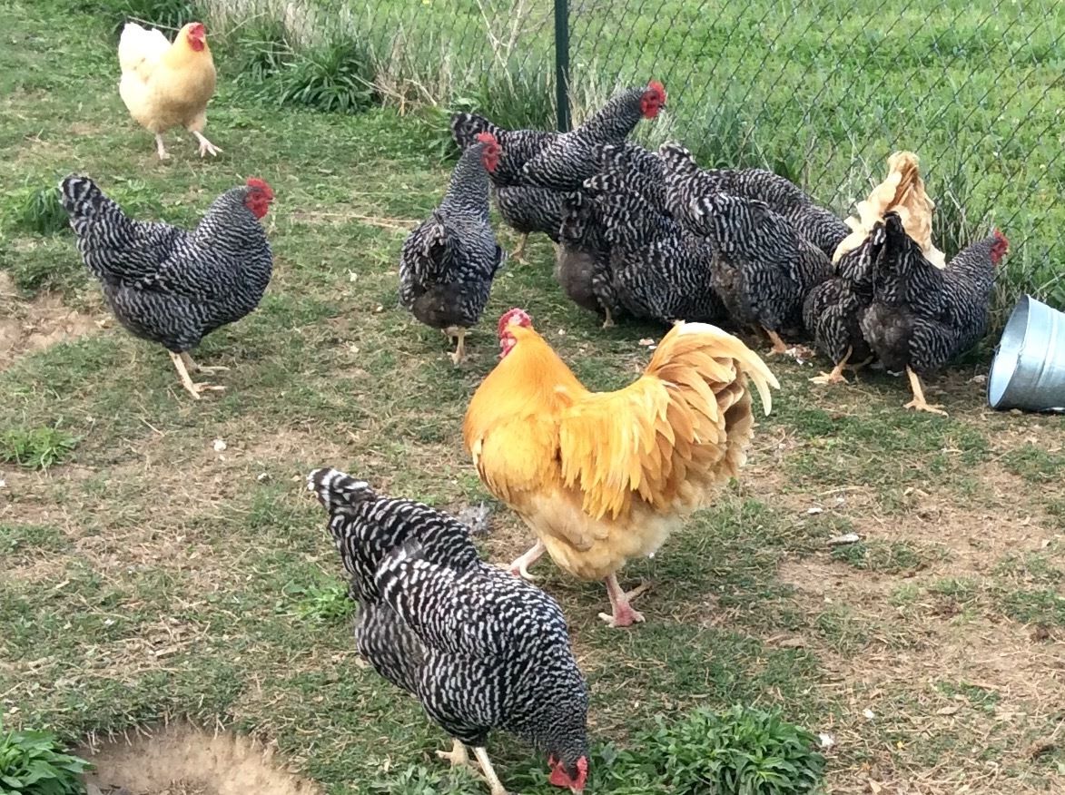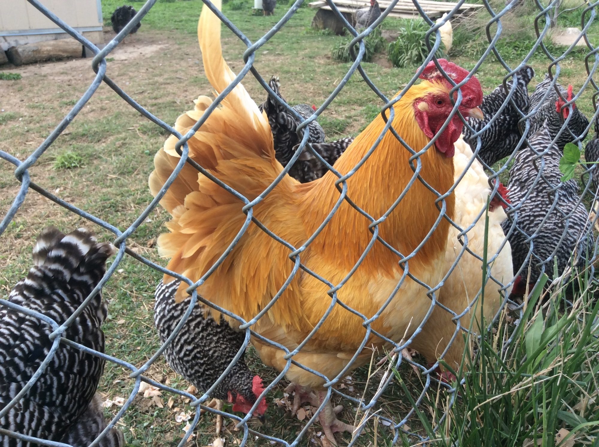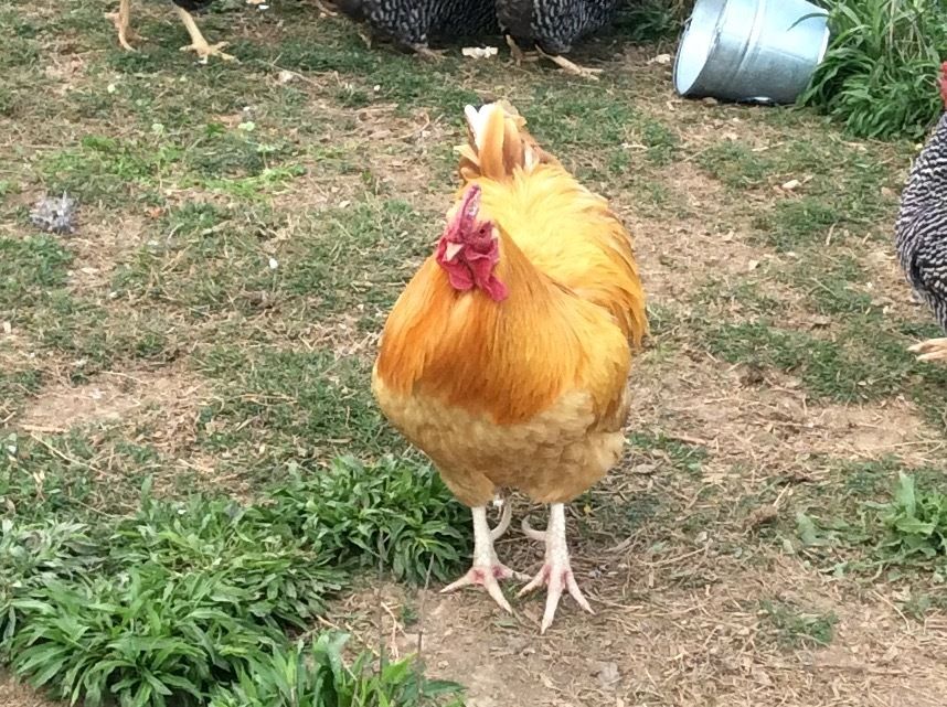 My 4 or 5 year old Buff Orpington Rooster, Elvis. He's had comb issues since frostbite took his tips. He came with 2 ladies-Mama and Scraggles. Lone Survivor and Baby are their remaining offspring. I love the huge combs on the 2 original hens and their surly expressions. They were our 1st foray in chicken keeping and we got them at several months old and didn't think to handle them. So, they aren't cuddly BOs. I'd love to have more some day and be more hands on with them. I would be pumped to hold that giant rooster-he sounds like a 12lb bowling ball dropping off the roost in the morning!