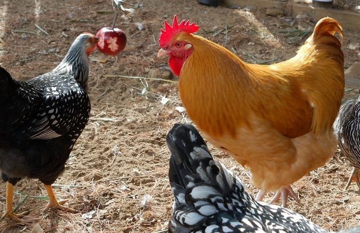 This is an older photo , but I have a large bolt with large washer and nut at the bottom to hold the fruit. It works well for cabbage (drill a hole first), large squash etc., as well. I take the bolt off and hang large bundles of kale from the garden or bamboo, etc. by the rope. Its on a pulley to the ceiling in the run, so I can raise/lower as needed. I also use a suet basket and stuff it with kale/greens and hang that on one of the outside perches for them to pick at.