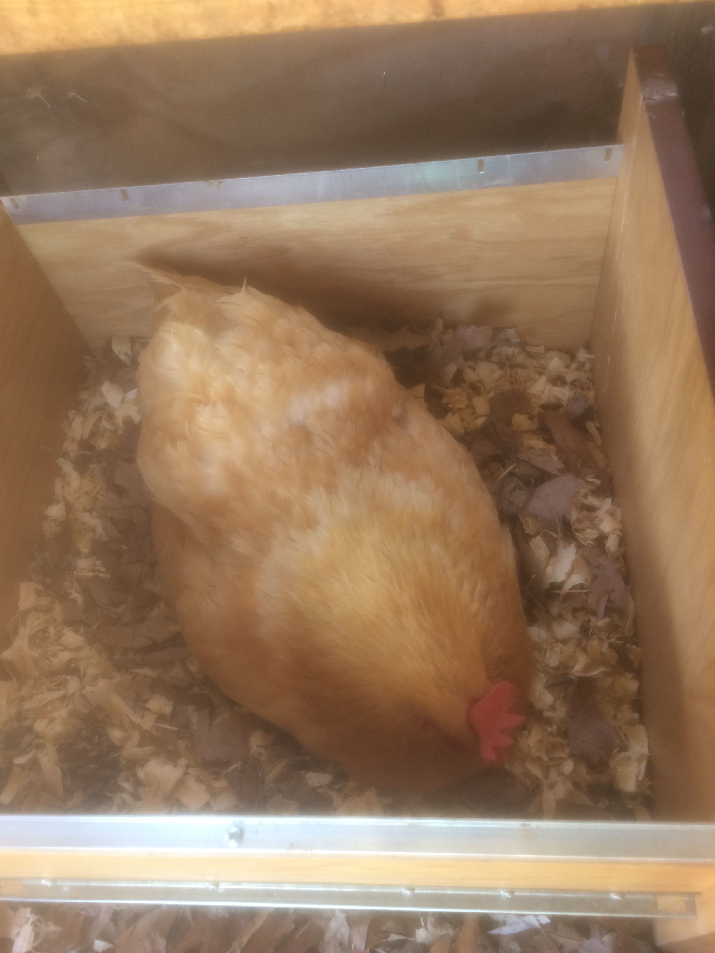 This is her own little broody house, I already moved her to it because the other hens were trying to jump in the nest. She didn't mind, I just picked up the whole box to more her.