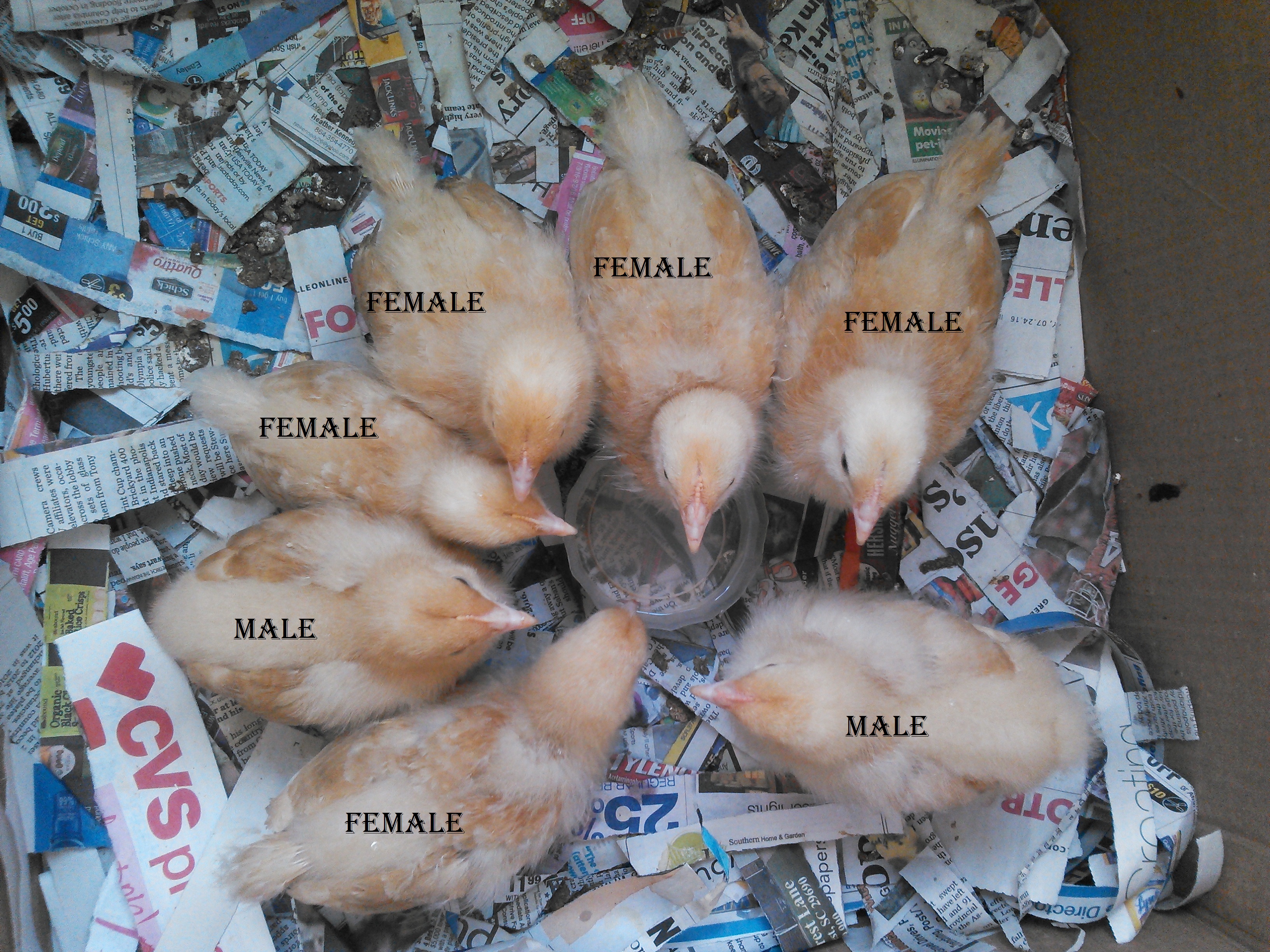 In fact this is a photo of the seven chicks that I got last July and the sex that each one of them turned out to be. Be sure to notice the tail feathers (or lack of) and wing feather lengths. This photo was taken at 2.5 weeks of age. It shows that the tail feather length is an excellent indicator of sex at that age.![]()
