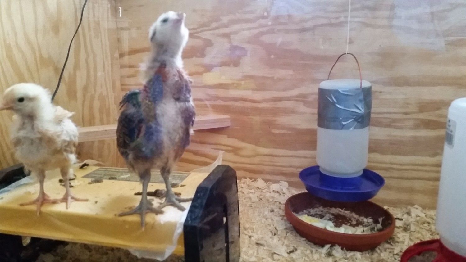 They're also very messy. I was able to drill a couple of holes in their feeder and hung it up and so far it has been great at keeping out pine shavings and poop. I tried to find a waterer with a handle on top so I could hang that too, but the smallest they sell around here is 2 gallons, which is too big for our brooder.