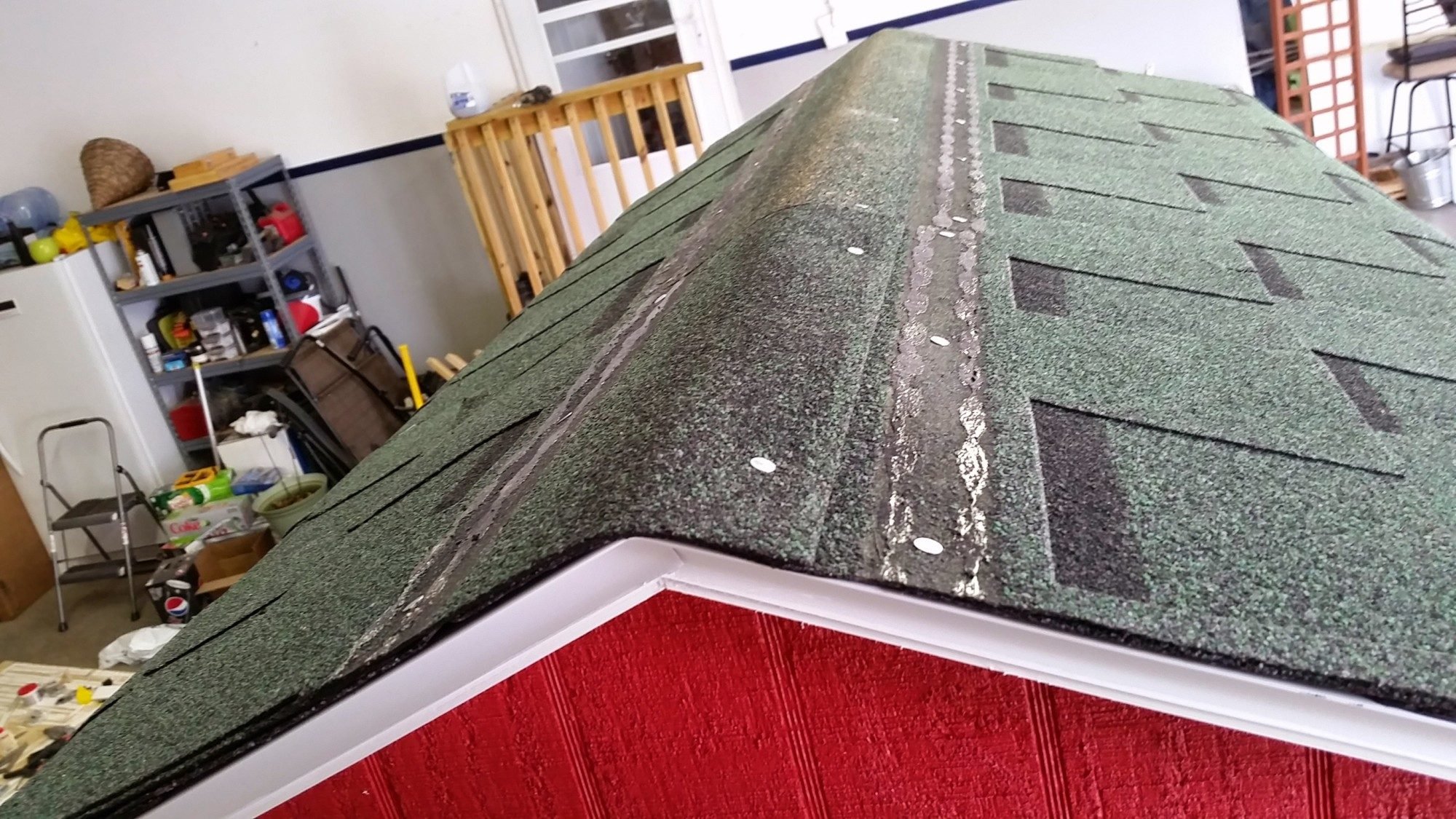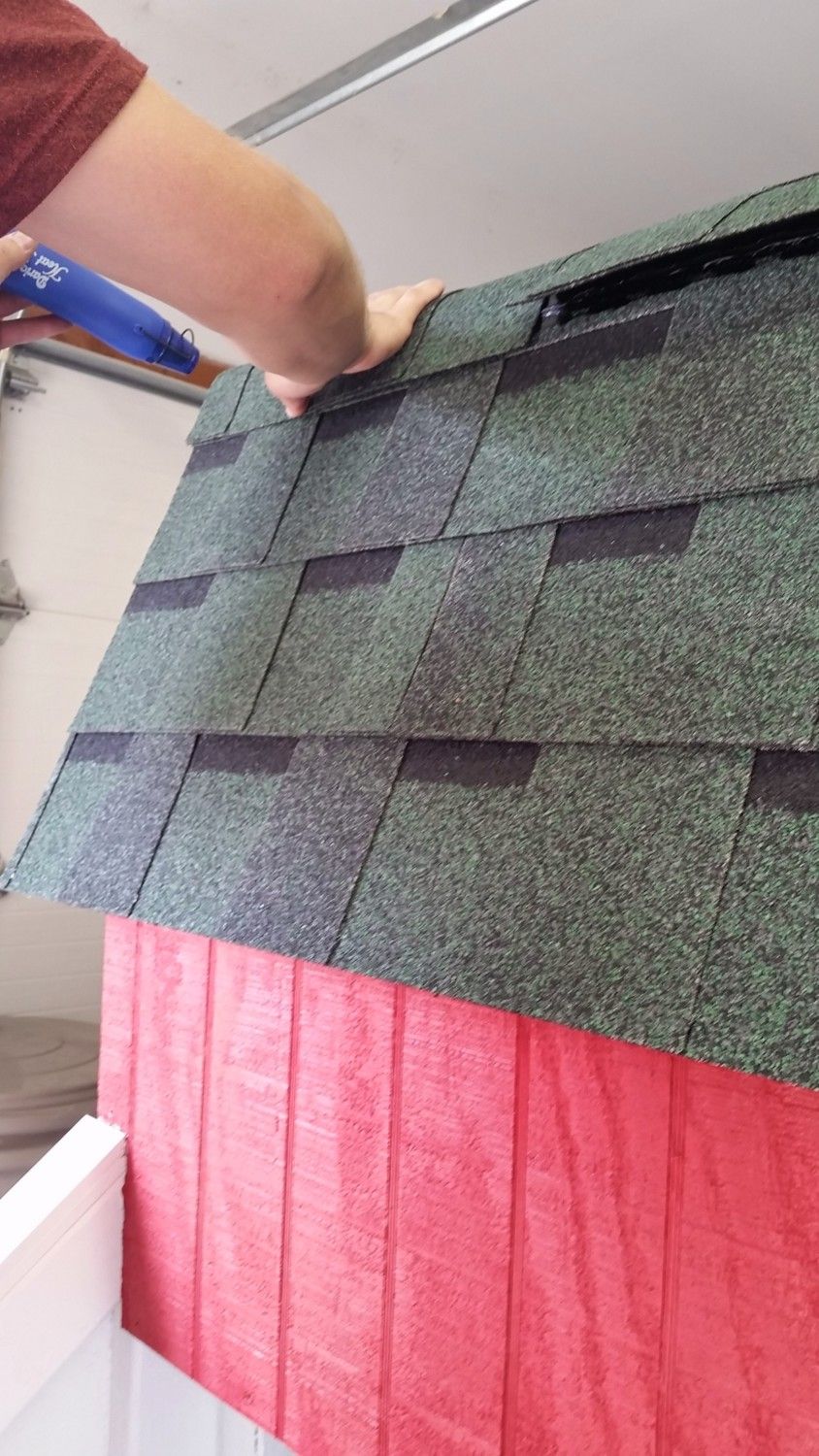 We did the shingling during a cloudy day. I learned that the reason you're supposed to shingle a roof on a hot sunny day is so that the sun can make the tar sticky and seal the shingles to each other. Since we didn't have any sun, we used the heat gun to go allover the shingles and made sure everything was sealed tight. Heat also makes the shingles more pliable and easier to work with.