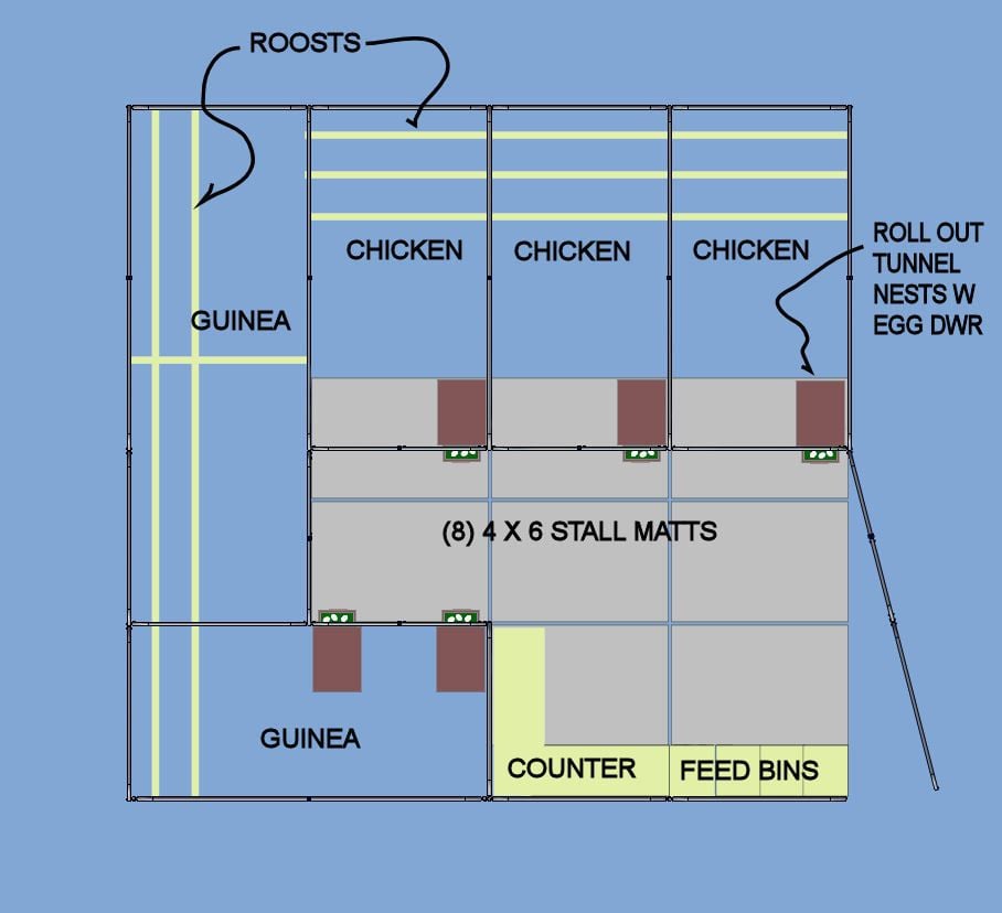Part of my reasoning for the compact area is to be able to back the truck up and off load feed directly in the house. the very first partiton by the big door will be reinforced for Goats so I can have a couple. The stall mats will allow me to use my walker or a wheel chair if it comes to that. The roll out nests will have access in the aisle so will all feed and water.