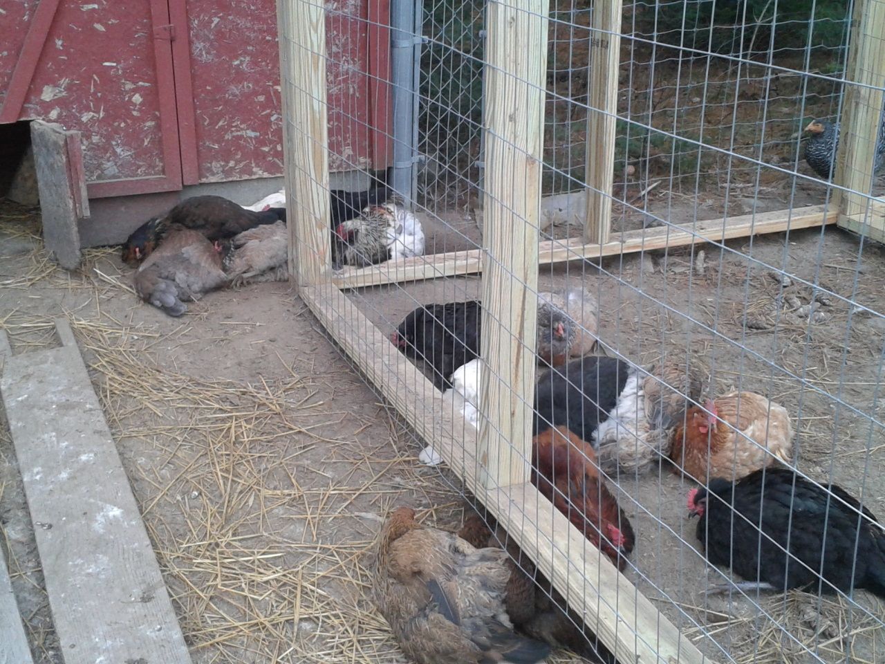 So what I did was cut six foot lengths of PVC just long enough to go from grommet to grommet on a six foot wide tarp. Then I ran baling twine through the pvcand the grommets. Sort of like making stays in the tarps. now i could tie the tarp up inside the coop without having it hang or rubbing on the chainlink. Beauty of it is when it does rain very little water collects on the tarps at all because they are never flat they always have little peaks and valleys. The tarps I buy are six by eight.... enough to cover three quarters of an enclosuer.
