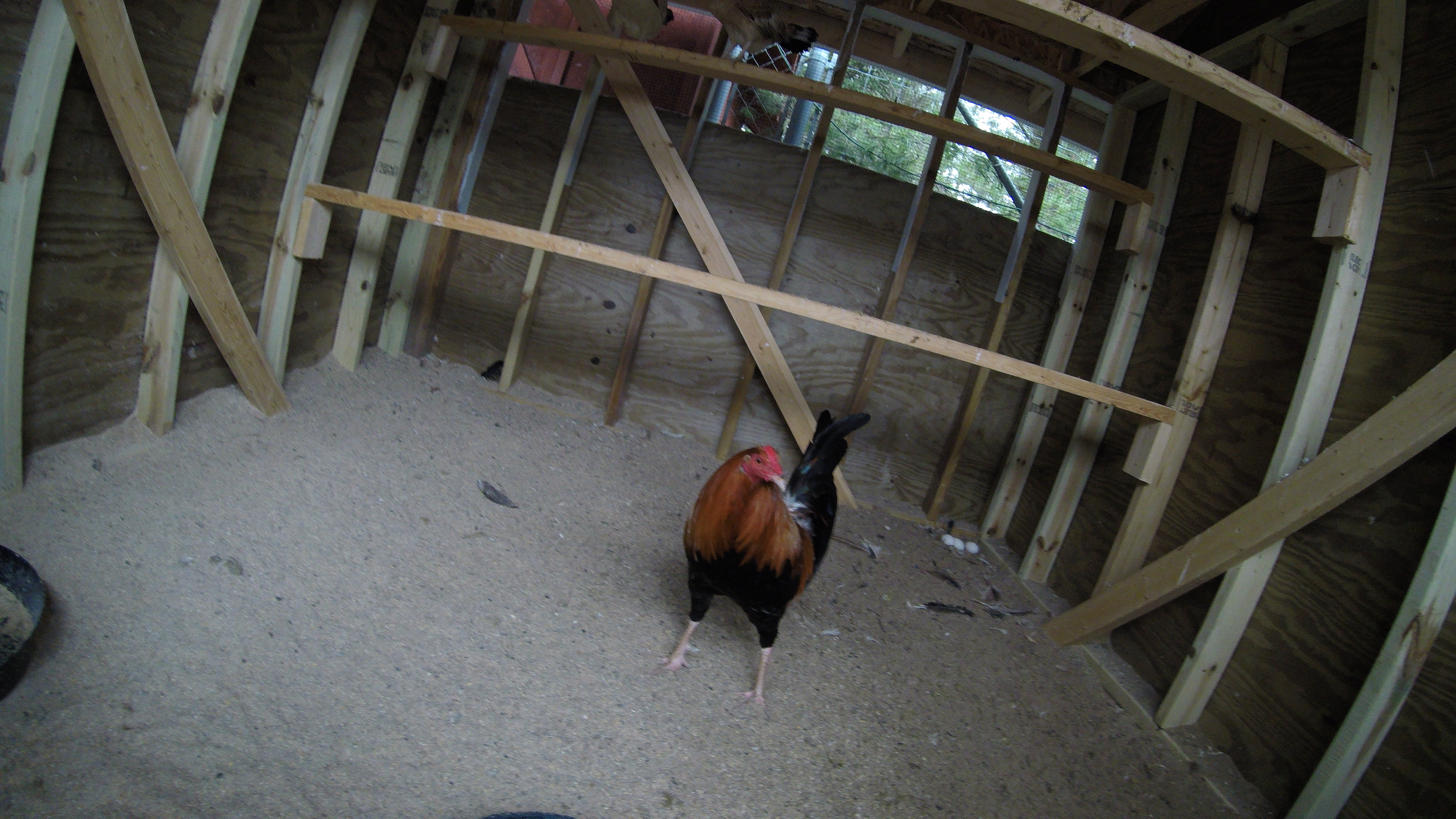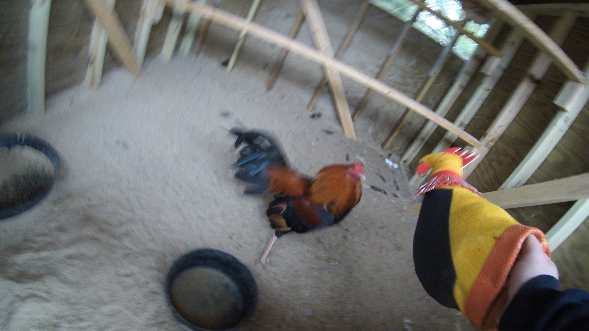 also have to add that this fake rooster is not being used tor fighting chickens it is being used so I don't get holes in my legs and so that I can keep myself safe and be able to feed/water and collect eggs. as you can see I cannot get to his eggs in the far right corner. so don't get it twisted.